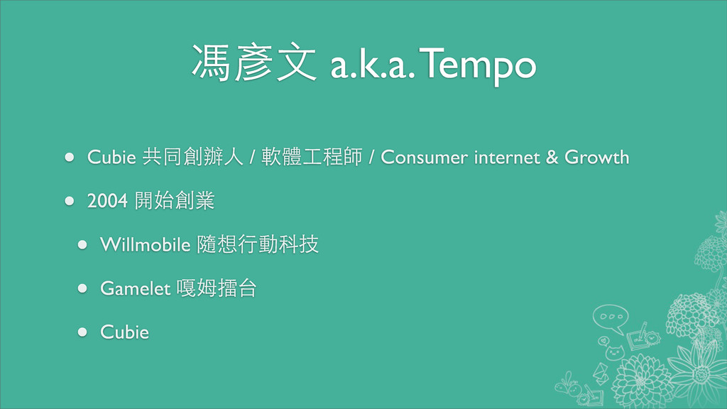 馮彥⽂文 a.k.a. Tempo • Cubie 共同創辦⼈人 / 軟體⼯工程師 / Consumer