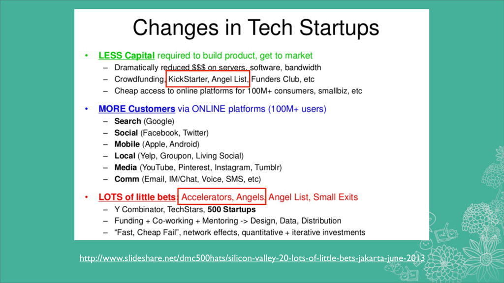 Text http://www.slideshare.net/dmc500hats/silicon-valley-20-lots-of-little-bets-jakarta-june-2013