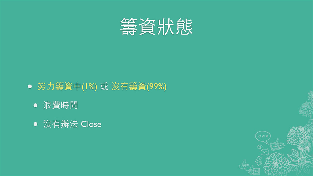 籌資狀態 • 努⼒力籌資中(1%) 或 沒有籌資(99%) • 浪費時間 • 沒有辦法 Close