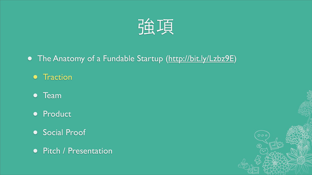 強項 • The Anatomy of a Fundable Startup (http://bit.ly/Lzbz9E) •