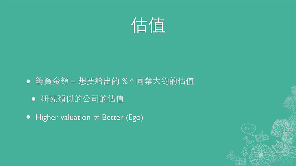 估值 • 籌資⾦金額 = 想要給出的 % * 同業⼤大約的估值 • 研究類似的公司的估值