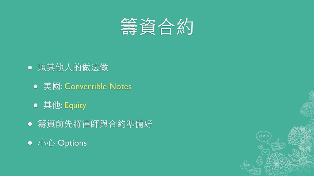 籌資合約 • 照其他⼈人的做法做 • 美國: Convertible Notes • 其他: Equity