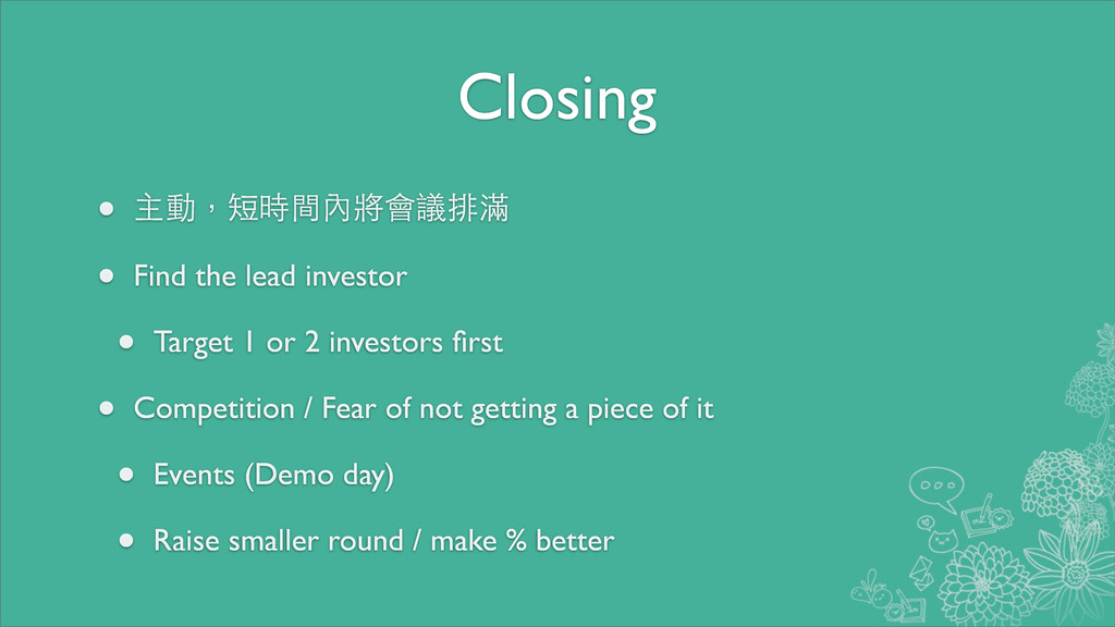 Closing • 主動,短時間內將會議排滿 • Find the lead investor • Target