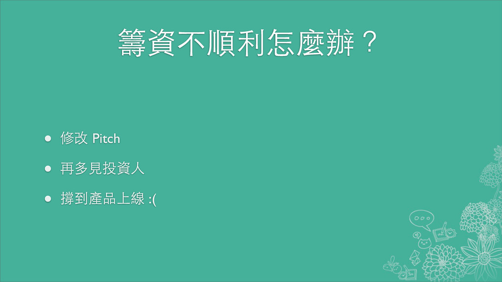 籌資不順利怎麼辦? • 修改 Pitch • 再多⾒見投資⼈人 • 撐到產品上線 :(