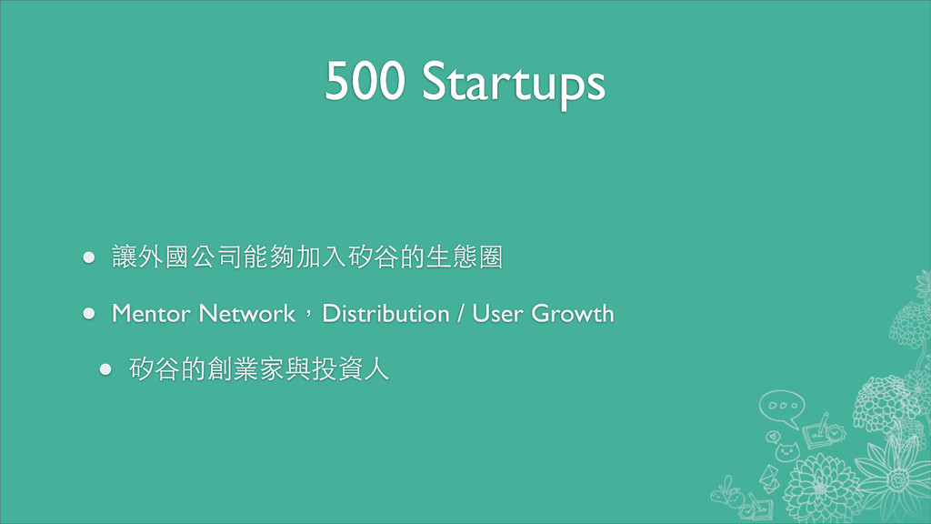 500 Startups • 讓外國公司能夠加⼊入矽⾕谷的⽣生態圈 • Mentor Network,Distribution / User Growth