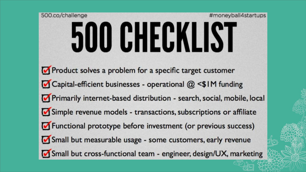 對象 • 與投資⼈人多認識 • > 100 (500 Startups, A/B test