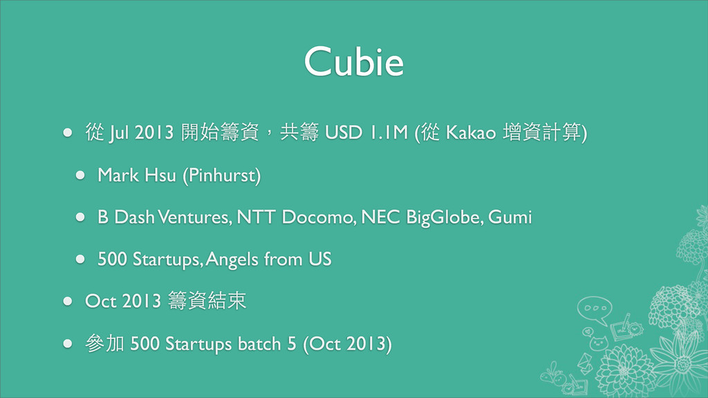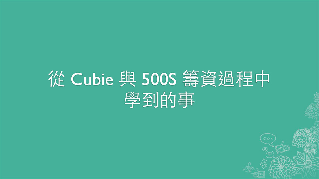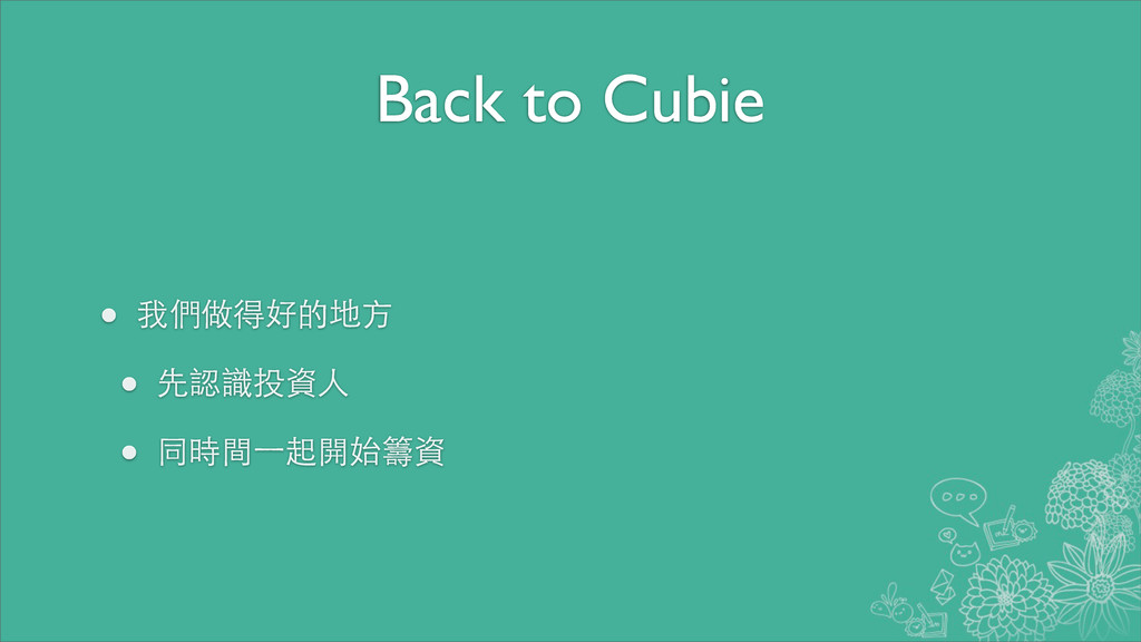 Back to Cubie • 我們做得好的地⽅方 • 先認識投資⼈人 • 同時間⼀一起開始籌資