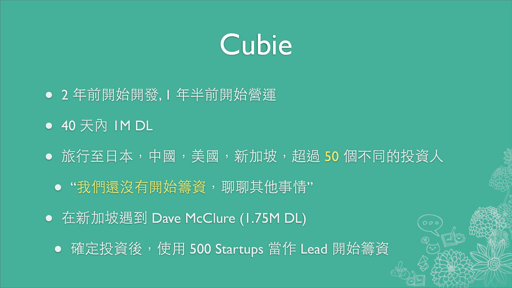 DL • 旅⾏行⾄至⽇日本,中國,美國,新加坡,超過 50 個不同的投資⼈人 • “我們還沒有開始籌資,聊聊其他事情” • 在新加坡遇到 Dave McClure (1.75M DL) • 確定投資後,使⽤用 500 Startups 當作 Lead 開始籌資