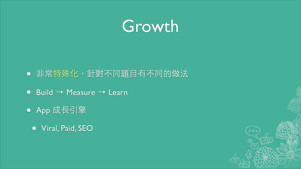 Growth • ⾮非常特殊化,針對不同題⺫⽬目有不同的做法 • Build → Measure → Learn •