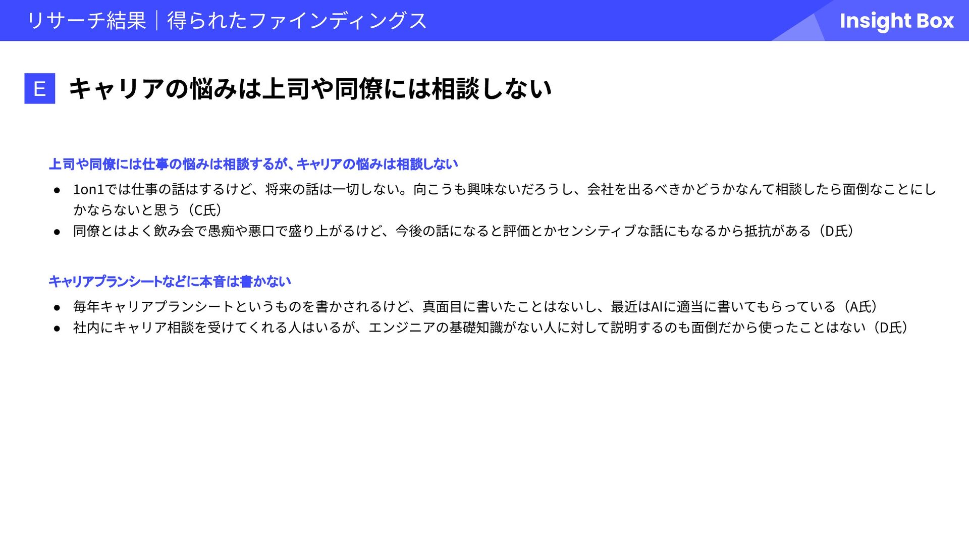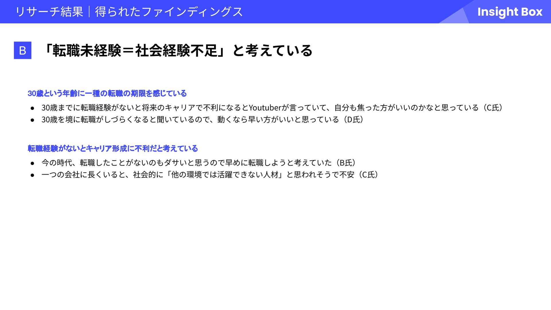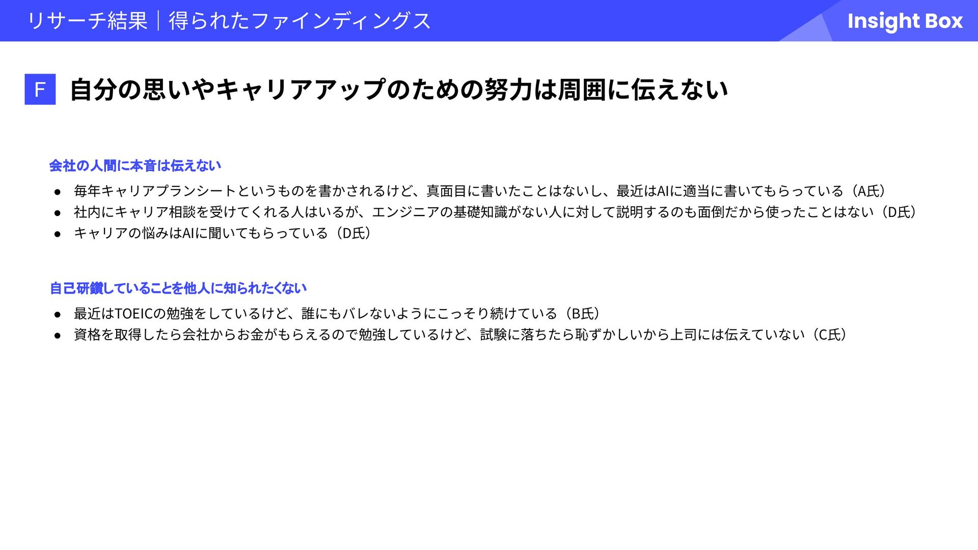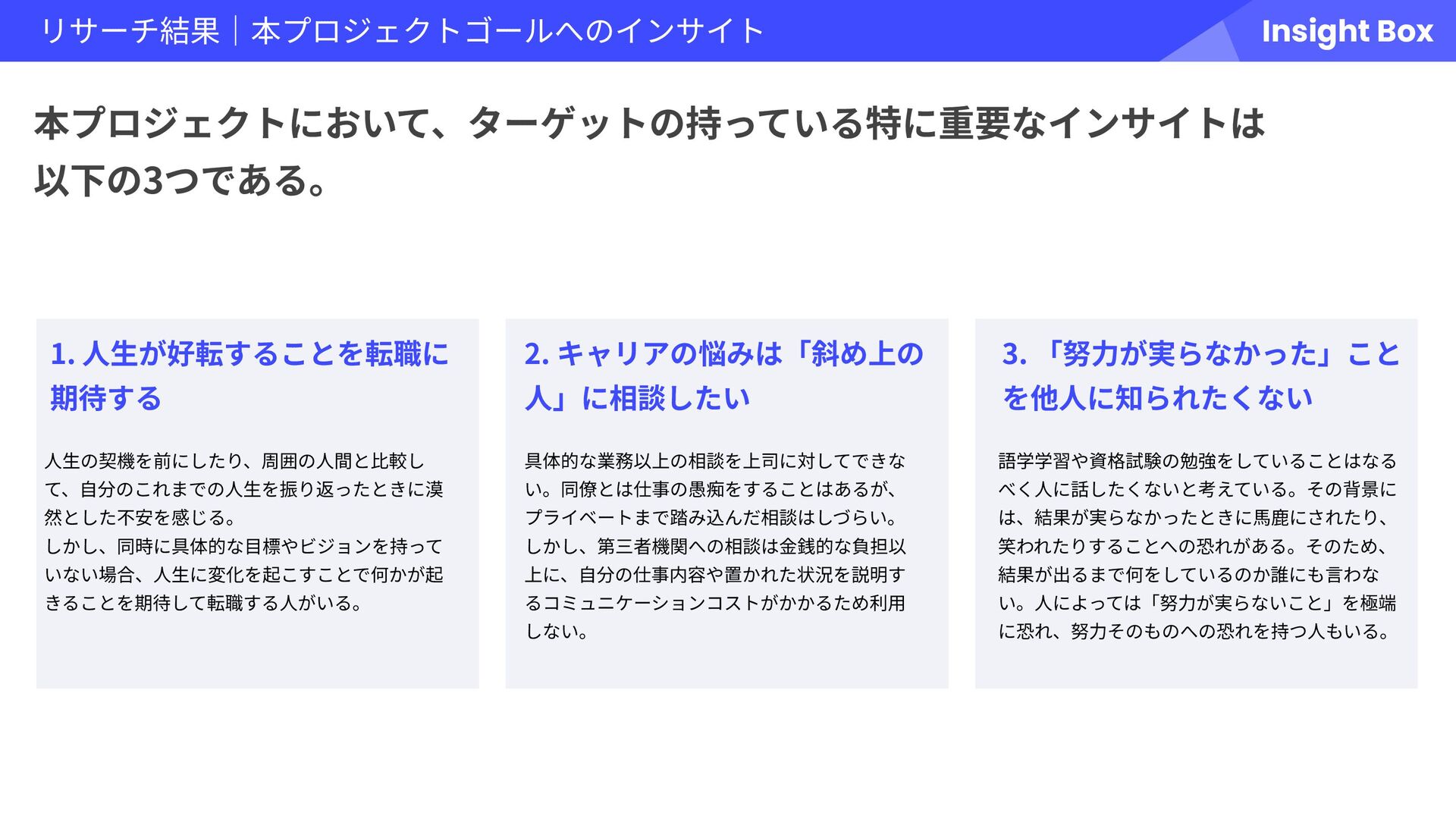 「努⼒が実らなかった」こと を他⼈に知られたくない ⼈⽣の契機を前にしたり、周囲の⼈間と⽐較し て、⾃分のこれまでの⼈⽣を振り返ったときに漠 然とした不安を感じる。 しかし、同時に具体的な⽬標やビジョンを持って いない場合、⼈⽣に変化を起こすことで何かが起 きることを期待して転職する⼈がいる。 具体的な業務以上の相談を上司に対してできな い。同僚とは仕事の愚痴をすることはあるが、 プライベートまで踏み込んだ相談はしづらい。 しかし、第三者機関への相談は⾦銭的な負担以 上に、⾃分の仕事内容や置かれた状況を説明す るコミュニケーションコストがかかるため利⽤ しない。 語学学習や資格試験の勉強をしていることはなる べく⼈に話したくないと考えている。その背景に は、結果が実らなかったときに⾺⿅にされたり、 笑われたりすることへの恐れがある。そのため、 結果が出るまで何をしているのか誰にも⾔わな い。⼈によっては「努⼒が実らないこと」を極端 に恐れ、努⼒そのものへの恐れを持つ⼈もいる。 本プロジェクトにおいて、ターゲットの持っている特に重要なインサイトは 以下の3つである。
