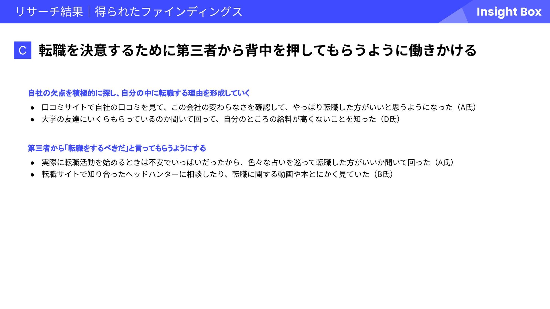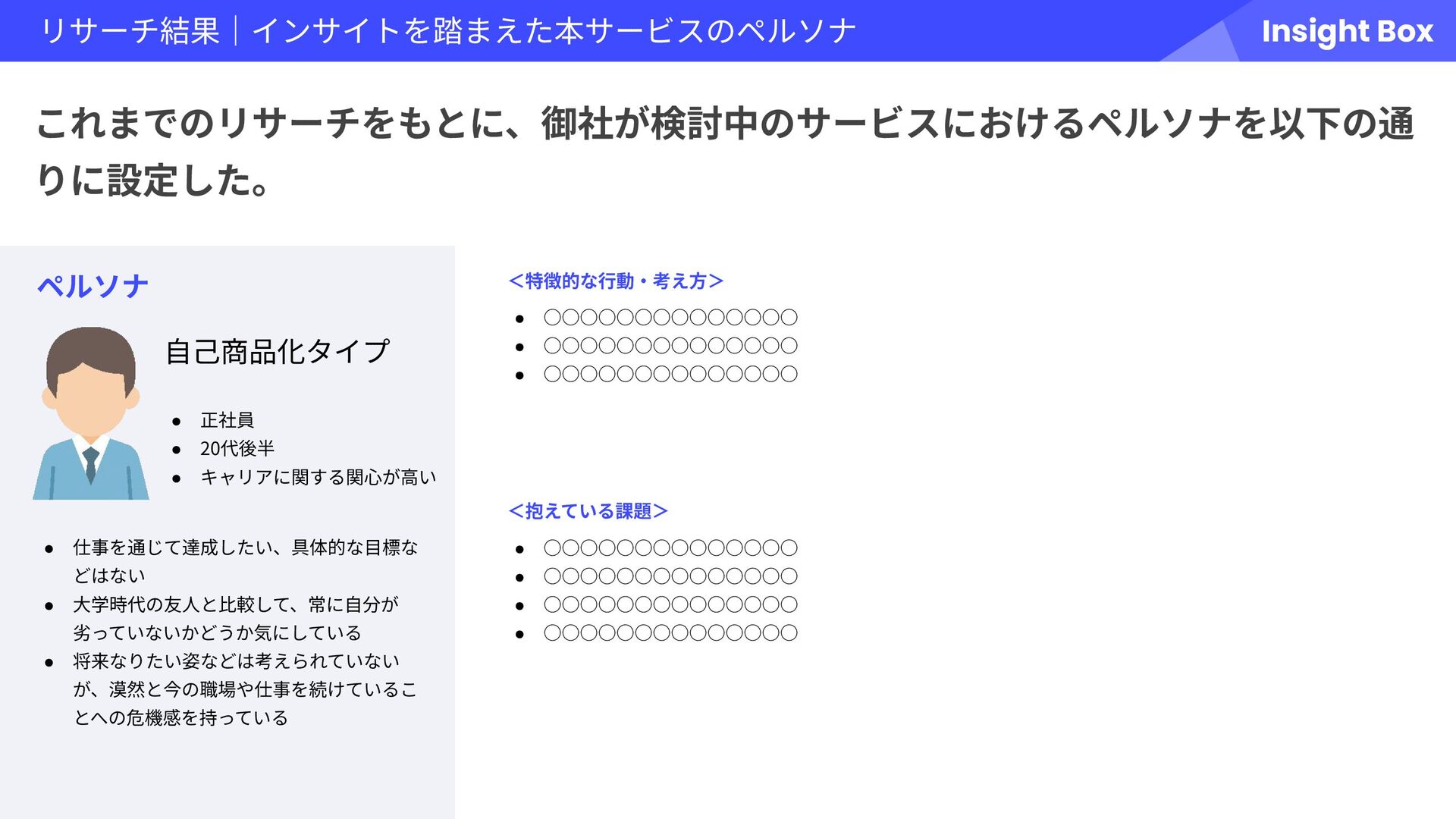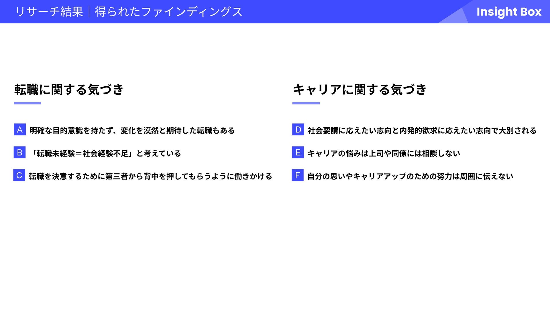 「努⼒が実らなかった」こと を他⼈に知られたくない ⼈⽣の契機を前にしたり、周囲の⼈間と⽐較し て、⾃分のこれまでの⼈⽣を振り返ったときに漠 然とした不安を感じる。 しかし、同時に具体的な⽬標やビジョンを持って いない場合、⼈⽣に変化を起こすことで何かが起 きることを期待して転職する⼈がいる。 具体的な業務以上の相談を上司に対してできな い。同僚とは仕事の愚痴をすることはあるが、 プライベートまで踏み込んだ相談はしづらい。 しかし、第三者機関への相談は⾦銭的な負担以 上に、⾃分の仕事内容や置かれた状況を説明す るコミュニケーションコストがかかるため利⽤ しない。 語学学習や資格試験の勉強をしていることはなる べく⼈に話したくないと考えている。その背景に は、結果が実らなかったときに⾺⿅にされたり、 笑われたりすることへの恐れがある。そのため、 結果が出るまで何をしているのか誰にも⾔わな い。⼈によっては「努⼒が実らないこと」を極端 に恐れ、努⼒そのものへの恐れを持つ⼈もいる。 本プロジェクトにおいて、ターゲットの持っている特に重要なインサイトは 以下の3つである。