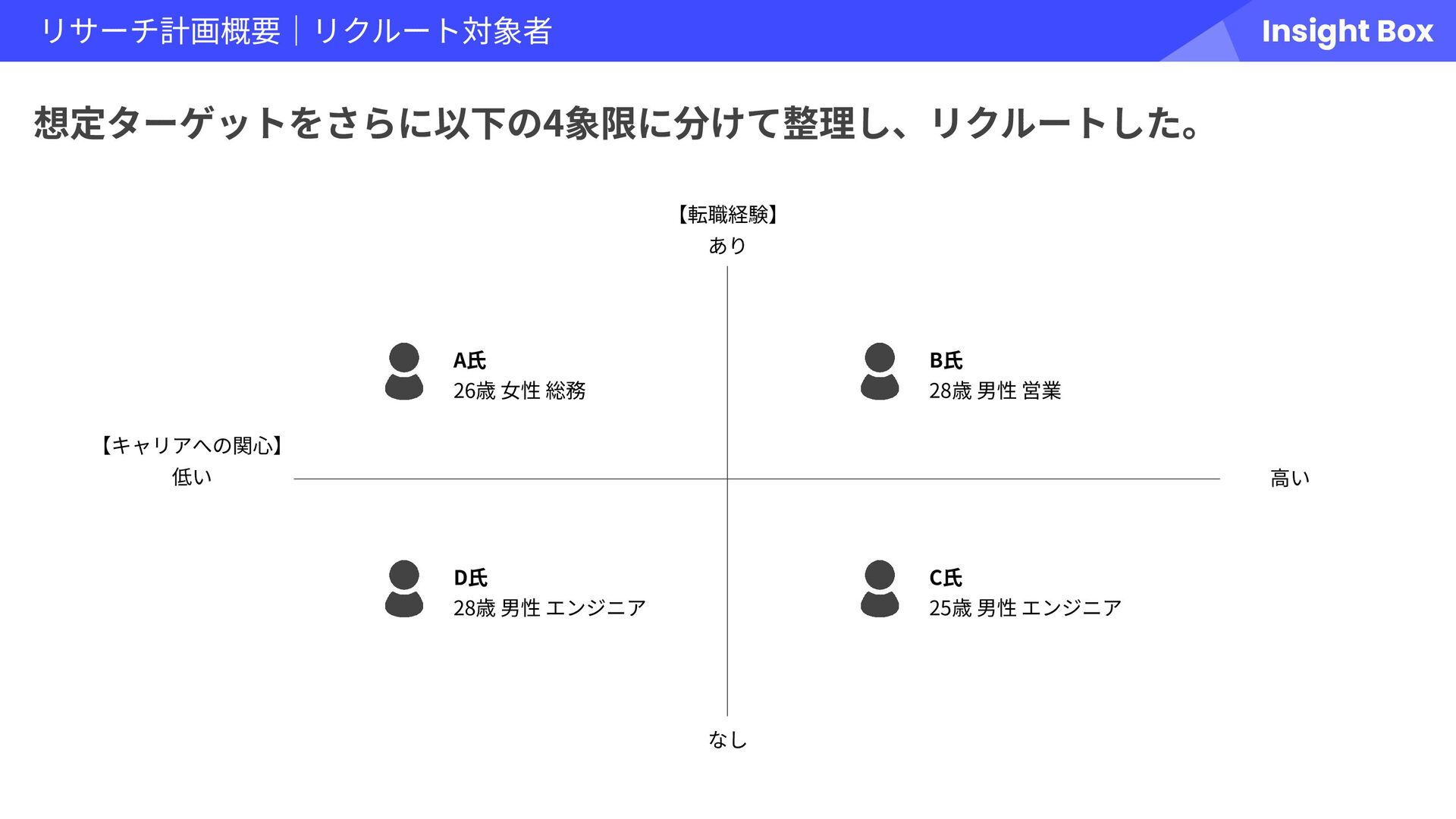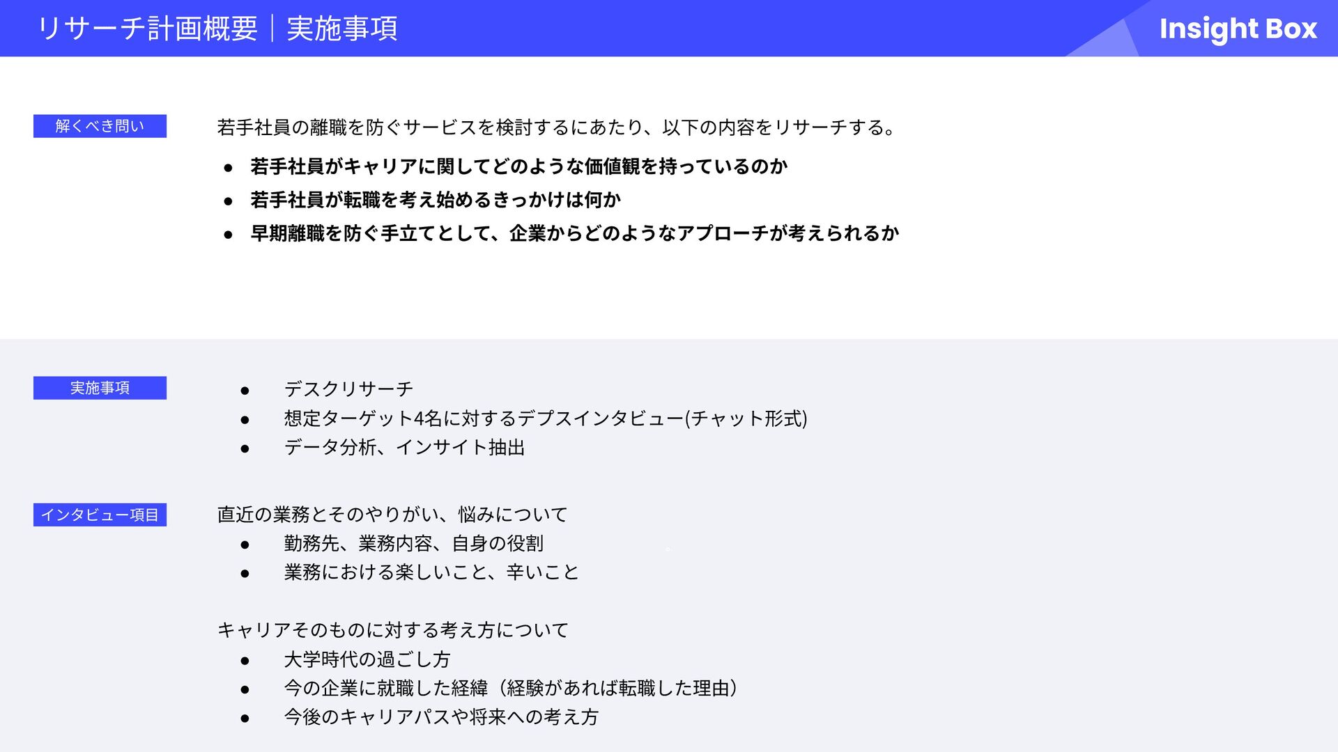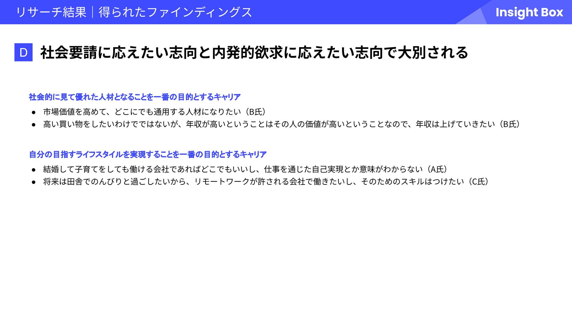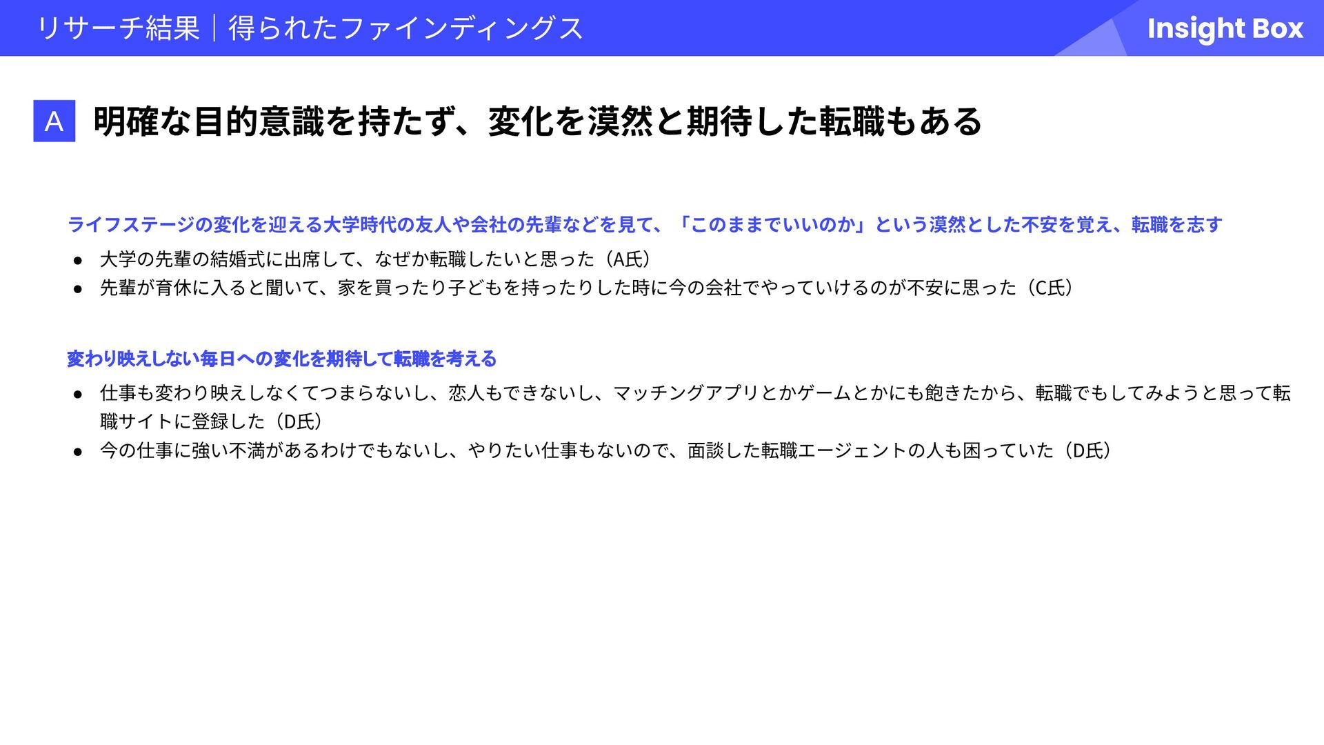 「努⼒が実らなかった」こと を他⼈に知られたくない ⼈⽣の契機を前にしたり、周囲の⼈間と⽐較し て、⾃分のこれまでの⼈⽣を振り返ったときに漠 然とした不安を感じる。 しかし、同時に具体的な⽬標やビジョンを持って いない場合、⼈⽣に変化を起こすことで何かが起 きることを期待して転職する⼈がいる。 具体的な業務以上の相談を上司に対してできな い。同僚とは仕事の愚痴をすることはあるが、 プライベートまで踏み込んだ相談はしづらい。 しかし、第三者機関への相談は⾦銭的な負担以 上に、⾃分の仕事内容や置かれた状況を説明す るコミュニケーションコストがかかるため利⽤ しない。 語学学習や資格試験の勉強をしていることはなる べく⼈に話したくないと考えている。その背景に は、結果が実らなかったときに⾺⿅にされたり、 笑われたりすることへの恐れがある。そのため、 結果が出るまで何をしているのか誰にも⾔わな い。⼈によっては「努⼒が実らないこと」を極端 に恐れ、努⼒そのものへの恐れを持つ⼈もいる。 本プロジェクトにおいて、ターゲットの持っている特に重要なインサイトは 以下の3つである。