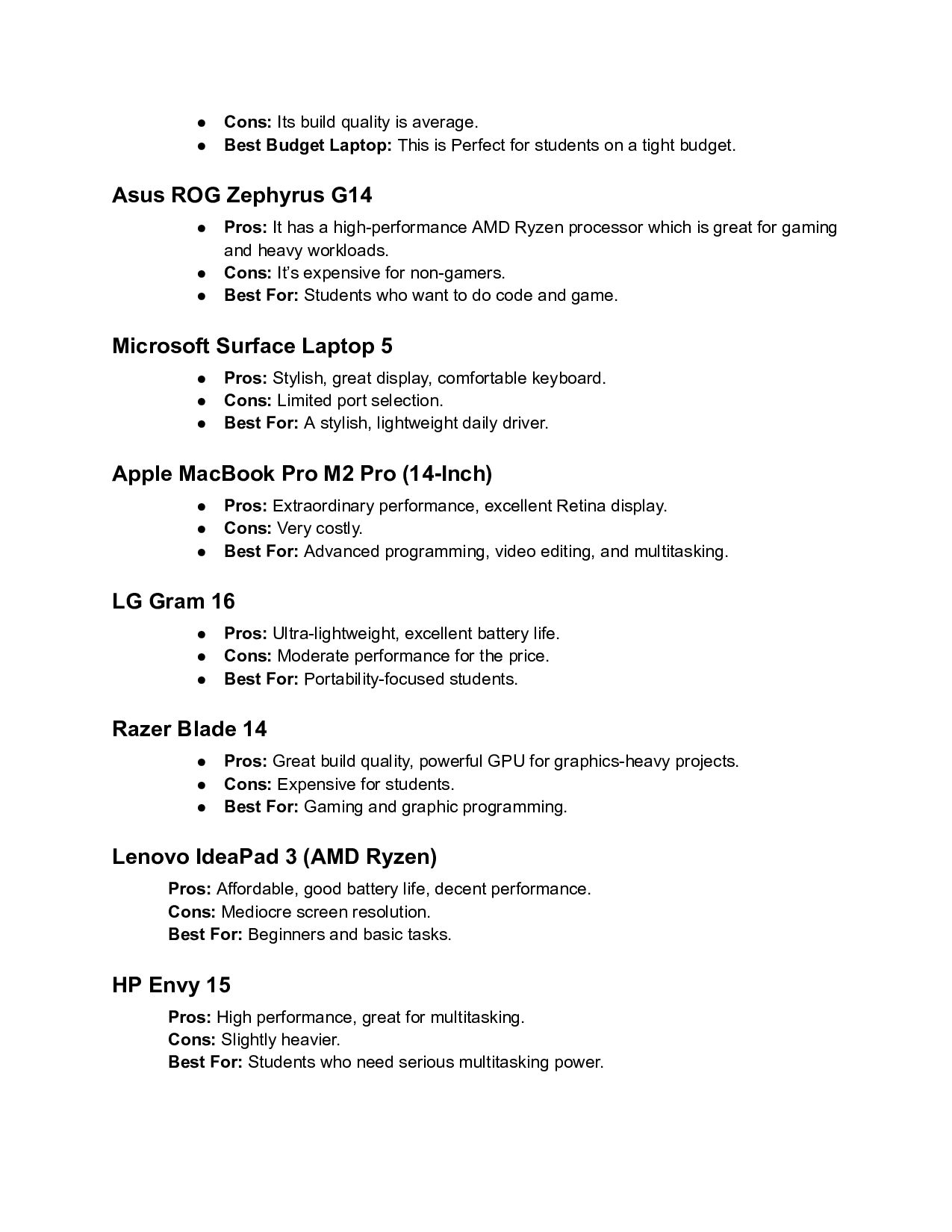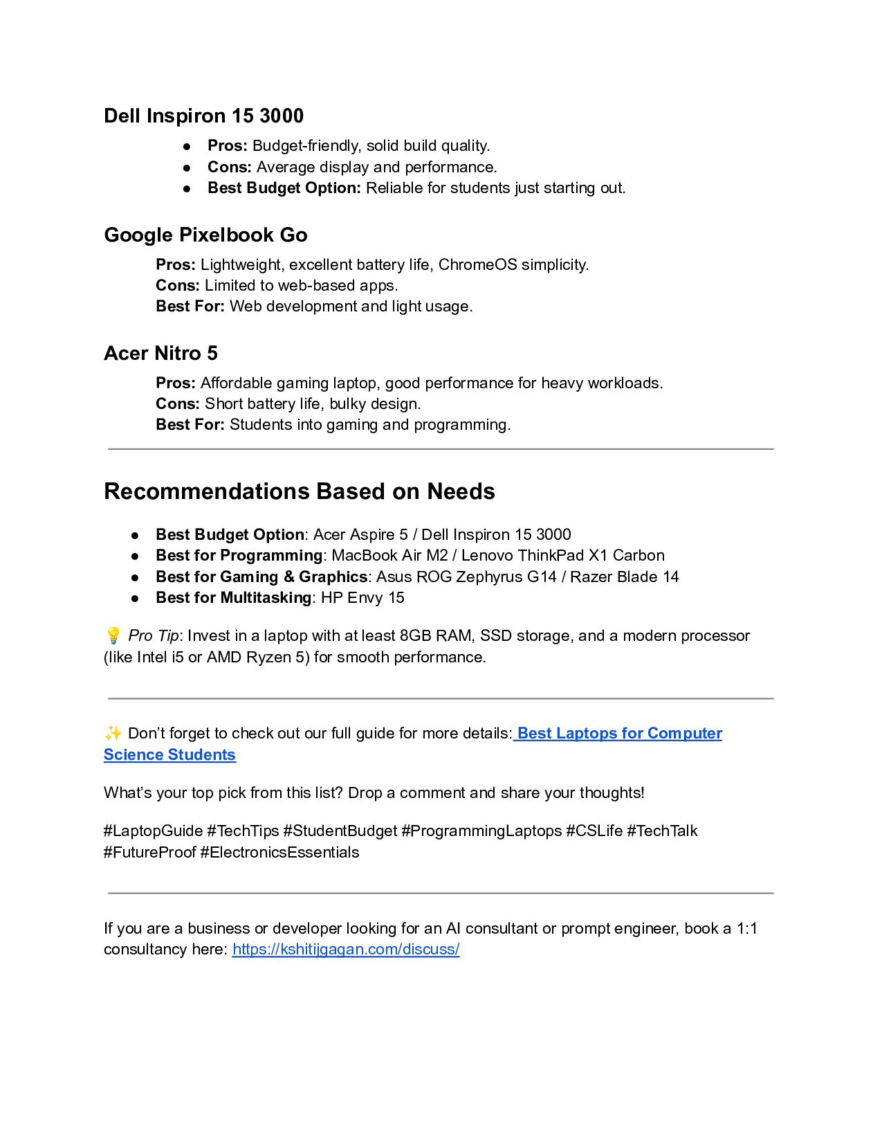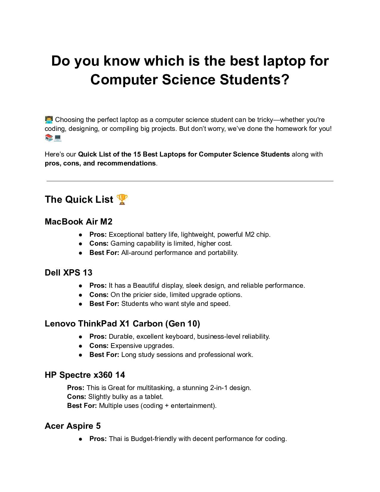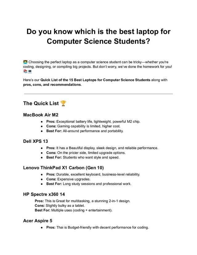 Science Students? 👨💻Choosing the perfect laptop as a computer science student can be tricky—whether you're coding, designing, or compiling big projects. But don’t worry, we’ve done the homework for you! 📚💻 Here’s our Quick List of the 15 Best Laptops for Computer Science Students along with pros, cons, and recommendations. The Quick List 🏆 MacBook Air M2 • Pros: Exceptional battery life, lightweight, powerful M2 chip. • Cons: Gaming capability is limited, higher cost. • Best For: All-around performance and portability. Dell XPS 13 • Pros: It has a Beautiful display, sleek design, and reliable performance. • Cons: On the pricier side, limited upgrade options. • Best For: Students who want style and speed. Lenovo ThinkPad X1 Carbon (Gen 10) • Pros: Durable, excellent keyboard, business-level reliability. • Cons: Expensive upgrades. • Best For: Long study sessions and professional work. HP Spectre x360 14 Pros: This is Great for multitasking, a stunning 2-in-1 design. Cons: Slightly bulky as a tablet. Best For: Multiple uses (coding + entertainment). Acer Aspire 5 • Pros: Thai is Budget-friendly with decent performance for coding.