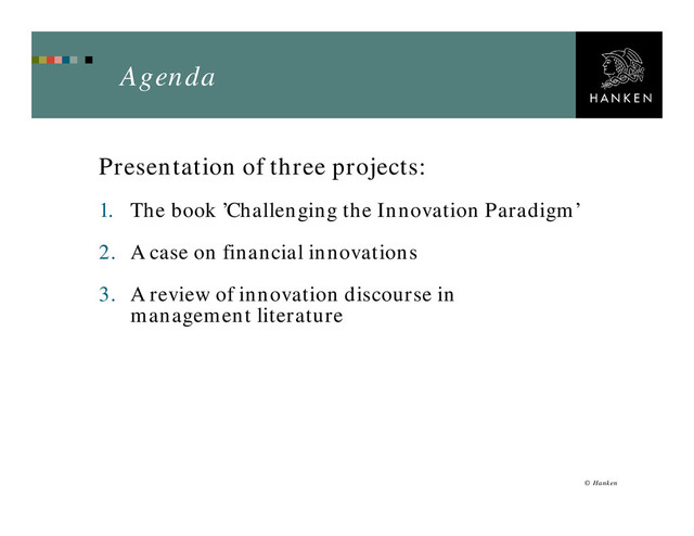 routinized Less than 0.5% discuss other consequences than the intended positive effects. Concern: Negative effects of innovation may be increasing. Negative effects and indirect consequences are neglected by research funding bodies Acceleration of innovation is encouraged on all levels in society ICT-enabled innovation is systemic - local effects become global Huge unexploited potential: Explore how to reduce negative and unintended effects of innovation. This will improve the net effects for society. Hanken Svenska handelshögskolan / Hanken School of Economics www.hanken.fi