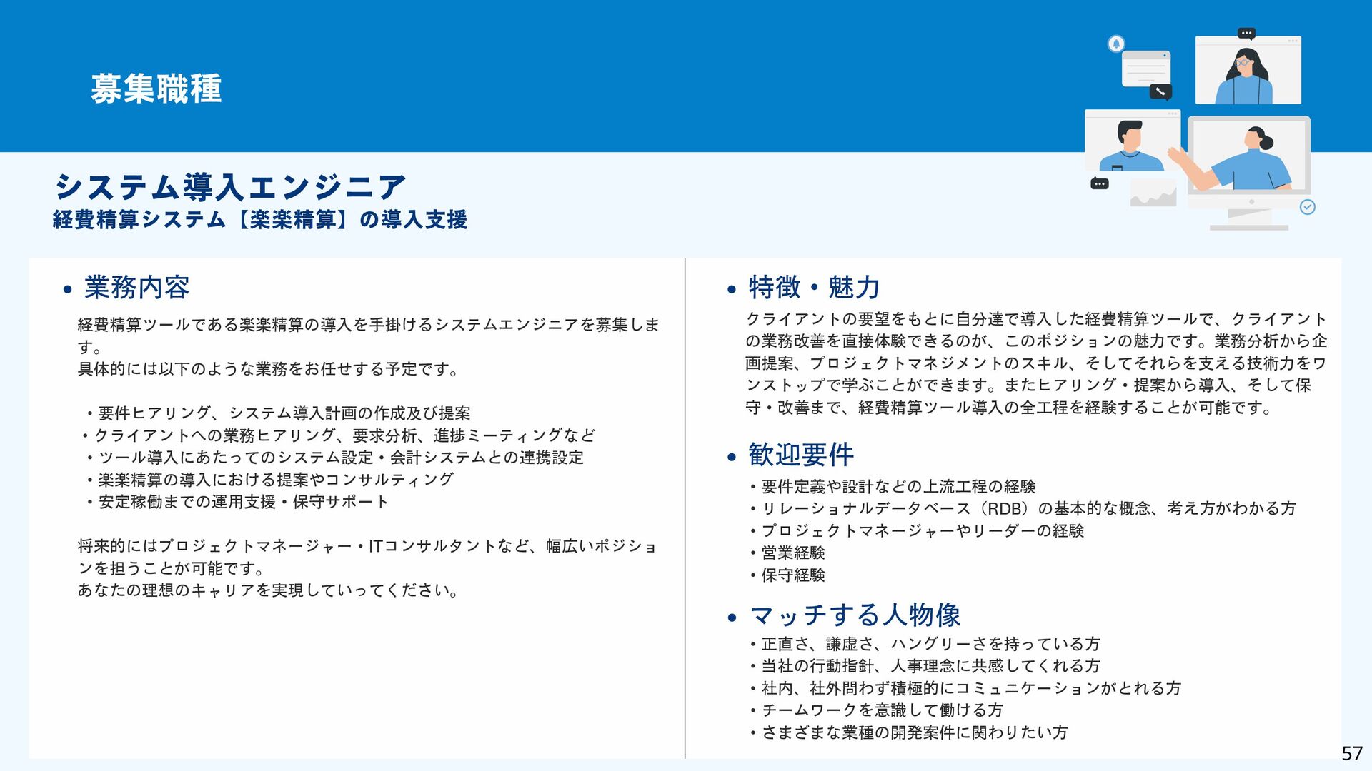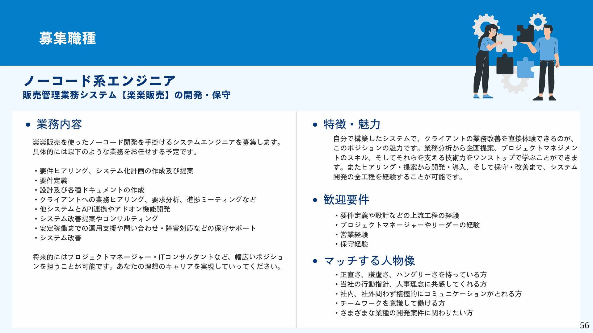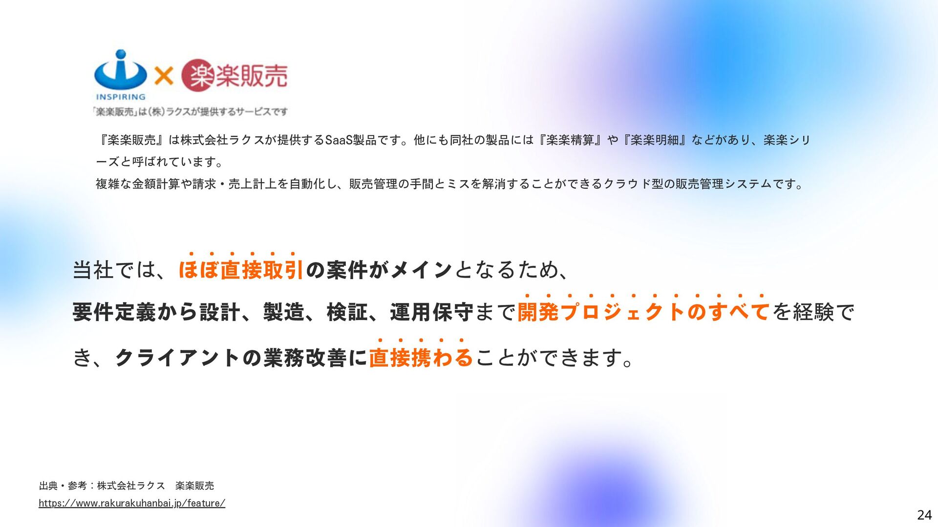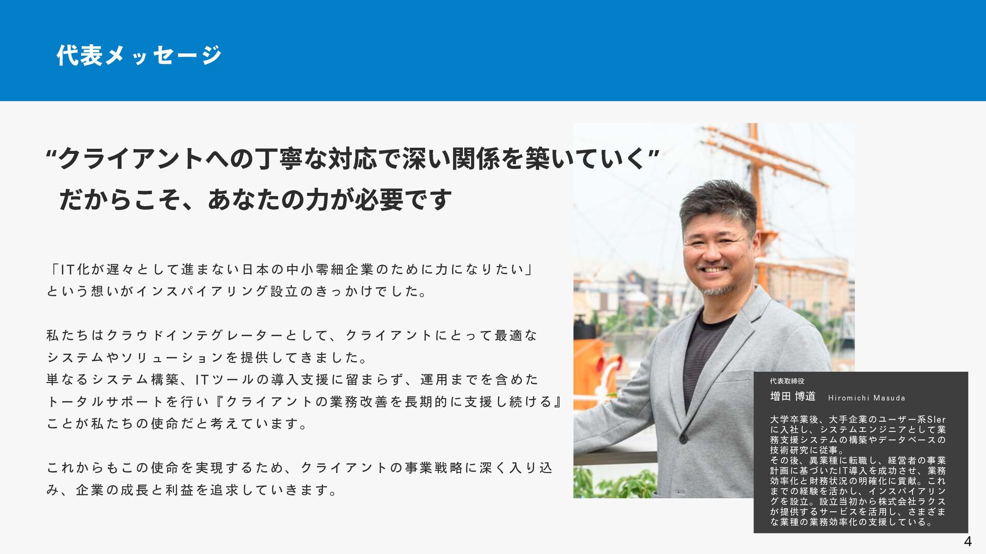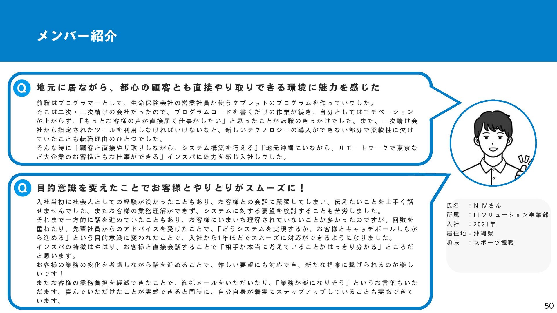 ー と し て 、 生 命 保 険 会 社 の 営 業 社 員 が 使 う タ ブ レ ッ ト の プ ロ グ ラ ム を 作 っ て い ま し た 。 そ こ は 二 次 ・ 三 次 請 け の 会 社 だ っ た の で 、 プ ロ グ ラ ム コ ー ド を 書 く だ け の 作 業 が 続 き 、 自 分 と し て は モ チ ベ ー シ ョ ン が 上 が ら ず 、 「 も っ と お 客 様 の 声 が 直 接 届 く 仕 事 が し た い 」 と 思 っ た こ と が 転 職 の き っ か け で し た 。 ま た 、 一 次 請 け 会 社 か ら 指 定 さ れ た ツ ー ル を 利 用 し な け れ ば い け な い な ど 、 新 し い テ ク ノ ロ ジ ー の 導 入 が で き な い 部 分 で 柔 軟 性 に 欠 け て い た こ と も 転 職 理 由 の ひ と つ で し た 。 そ ん な 時 に 『 顧 客 と 直 接 や り 取 り し な が ら 、 シ ス テ ム 構 築 を 行 え る 』 『 地 元 沖 縄 に い な が ら 、 リ モ ー ト ワ ー ク で 東 京 な ど 大 企 業 の お 客 様 と も お 仕 事 が で き る 』 イ ン ス パ に 魅 力 を 感 じ 入 社 し ま し た 。 入 社 当 初 は 社 会 人 と し て の 経 験 が 浅 か っ た こ と も あ り 、 お 客 様 と の 会 話 に 緊 張 し て し ま い 、 伝 え た い こ と を 上 手 く 話 せ ま せ ん で し た 。 ま た お 客 様 の 業 務 理 解 が で き ず 、 シ ス テ ム に 対 す る 要 望 を 検 討 す る こ と も 苦 労 し ま し た 。 そ れ ま で 一 方 的 に 話 を 進 め て い た こ と も あ り 、 お 客 様 に い ま い ち 理 解 さ れ て い な い こ と が 多 か っ た の で す が 、 回 数 を 重 ね た り 、 先 輩 社 員 か ら の ア ド バ イ ス を 受 け た こ と で 、 「 ど う シ ス テ ム を 実 現 す る か 、 お 客 様 と キ ャ ッ チ ボ ー ル し な が ら 進 め る 」 と い う 目 的 意 識 に 変 わ れ た こ と で 、 入 社 か ら 1 年 ほ ど で ス ム ー ズ に 対 応 が で き る よ う に な り ま し た 。 イ ン ス パ の 特 徴 は や は り 、 お 客 様 と 直 接 会 話 す る こ と で 「 相 手 が 本 当 に 考 え て い る こ と が は っ き り 分 か る 」 と こ ろ だ と 思 い ま す 。 お 客 様 の 業 務 の 変 化 を 考 慮 し な が ら 話 を 進 め る こ と で 、 難 し い 要 望 に も 対 応 で き 、 新 た な 提 案 に 繋 げ ら れ る の が 楽 し い で す ! ま た お 客 様 の 業 務 負 担 を 軽 減 で き た こ と で 、 御 礼 メ ー ル を い た だ い た り 、 「 業 務 が 楽 に な り そ う 」 と い う お 言 葉 も い た だ ま す 。 喜 ん で い た だ け た こ と が 実 感 で き る と 同 時 に 、 自 分 自 身 が 着 実 に ス テ ッ プ ア ッ プ し て い る こ と も 実 感 で き て い ま す 。 メンバー紹介 地 元 に 居 な が ら 、 都 心 の 顧 客 と も 直 接 や り 取 り で き る 環 境 に 魅 力 を 感 じ た 氏 名 : N . M さ ん 所 属 : I T ソ リ ュ ー シ ョ ン 事 業 部 入 社 : 2 0 2 1 年 居 住 地 : 沖 縄 県 趣 味 : ス ポ ー ツ 観 戦 目 的 意 識 を 変 え た こ と で お 客 様 と や り と り が ス ム ー ズ に ! 50