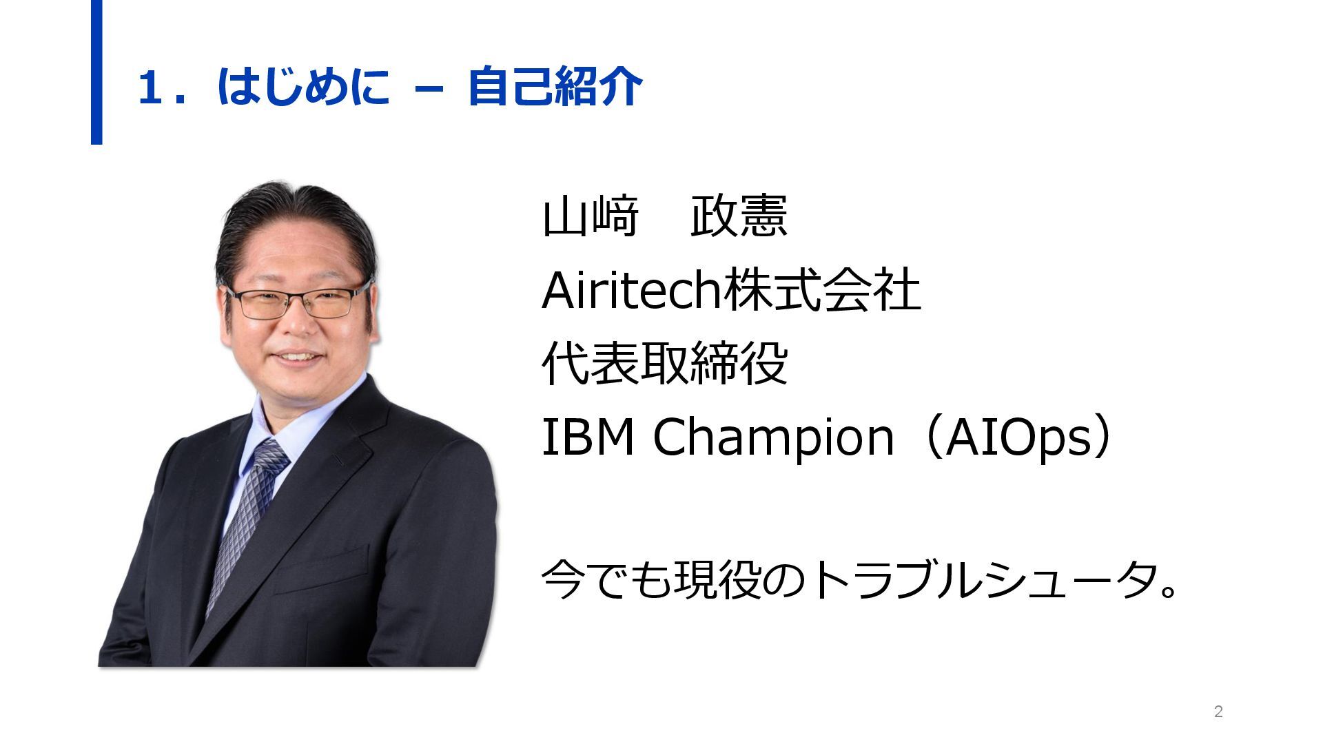 1.はじめに - 自己紹介 2 山﨑 政憲 Airitech株式会社 代表取締役 IBM Champion(AIOps)