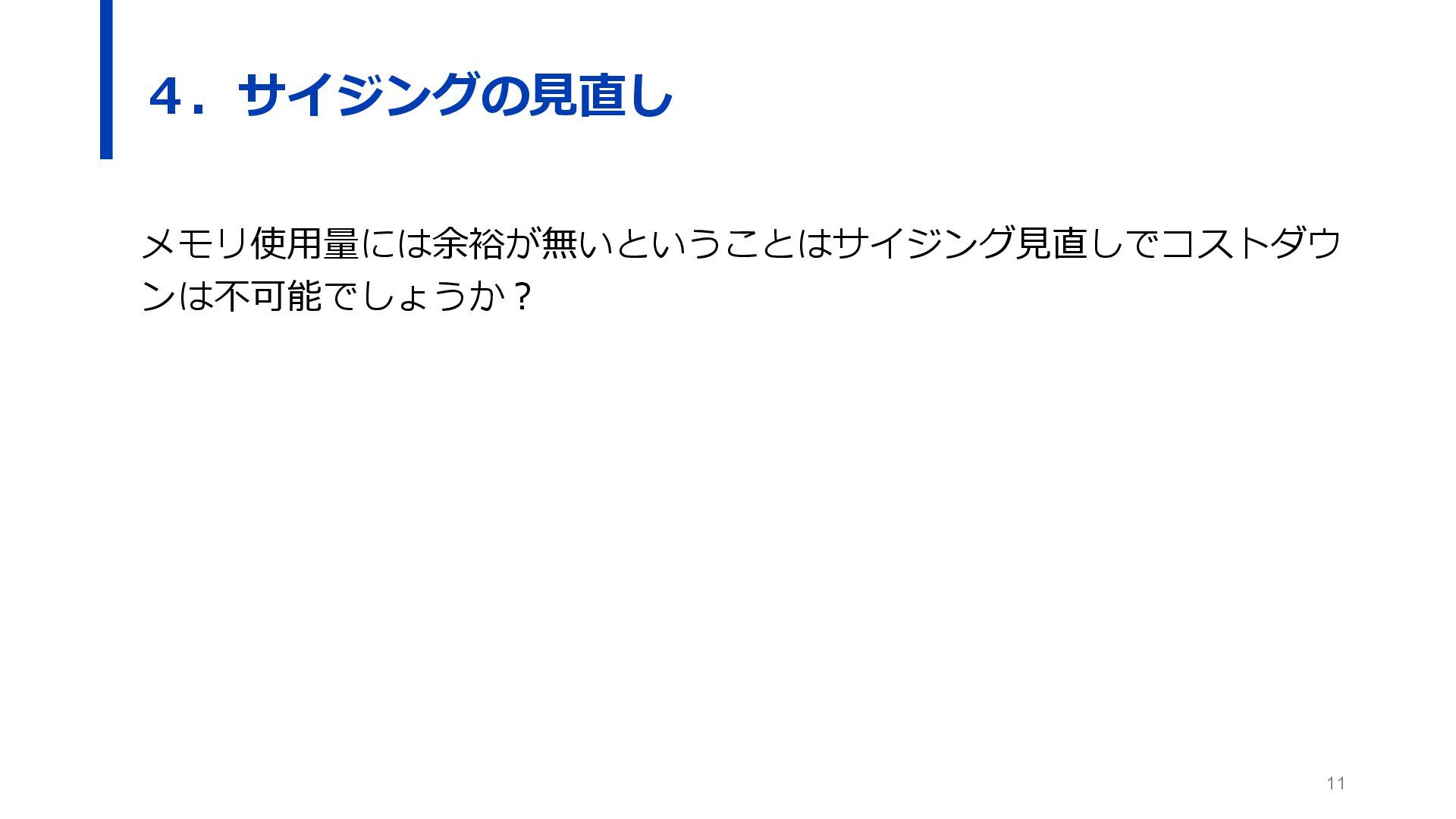 4.サイジングの見直し 11 メモリ使用量には余裕が無いということはサイジング見直しでコストダウ ンは不可能でしょうか?