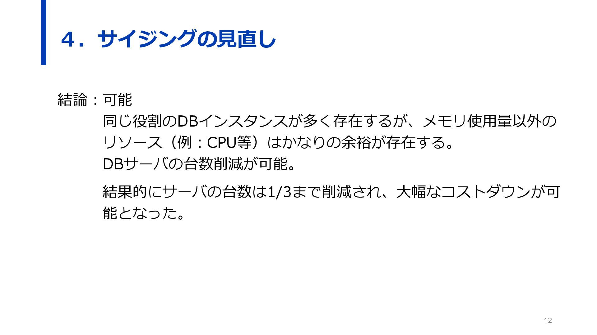 4.サイジングの見直し 12 結論:可能 同じ役割のDBインスタンスが多く存在するが、メモリ使用量以外の リソース(例:CPU等)はかなりの余裕が存在する。 DBサーバの台数削減が可能。 結果的にサーバの台数は1/3まで削減され、大幅なコストダウンが可 能となった。