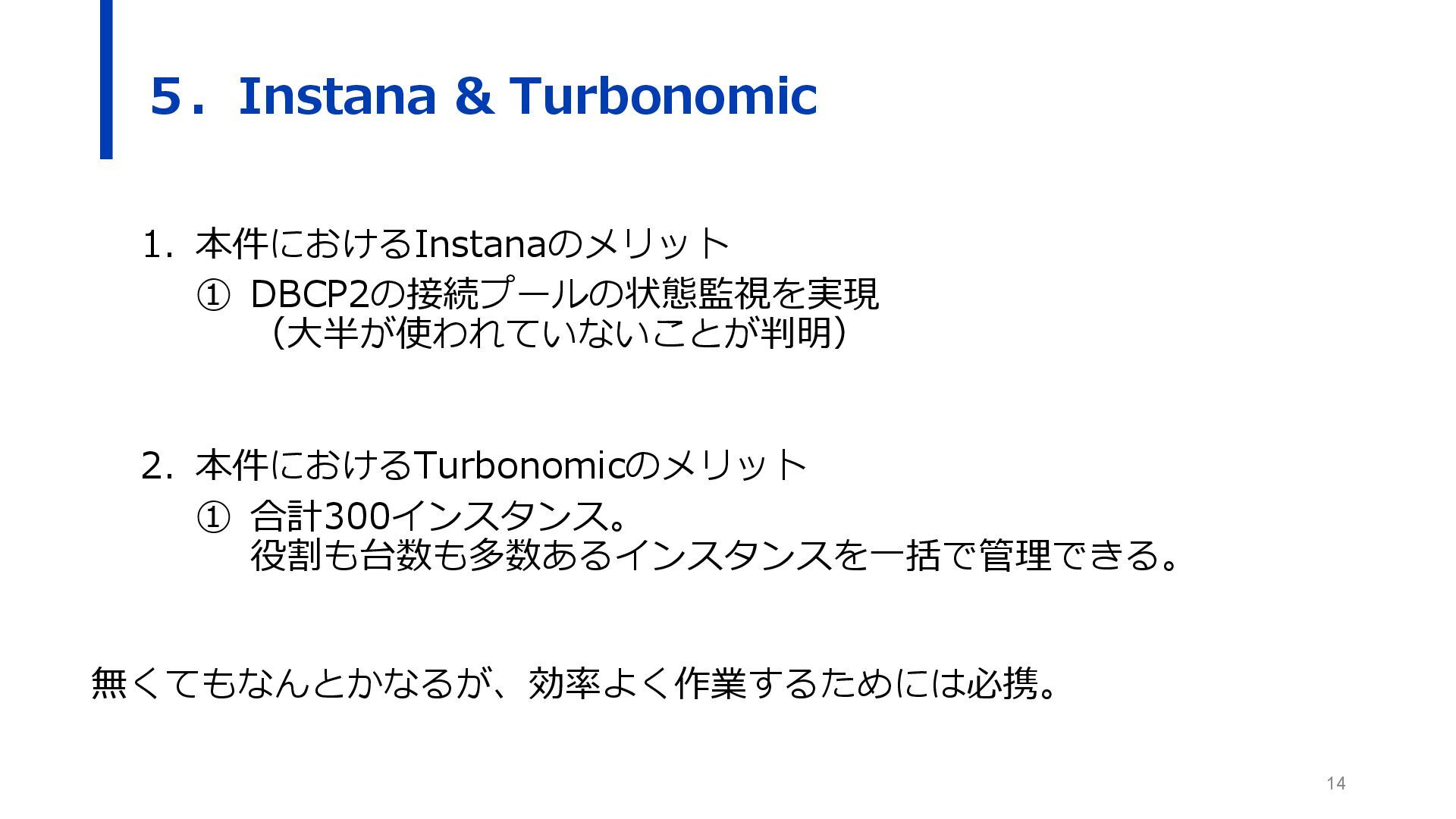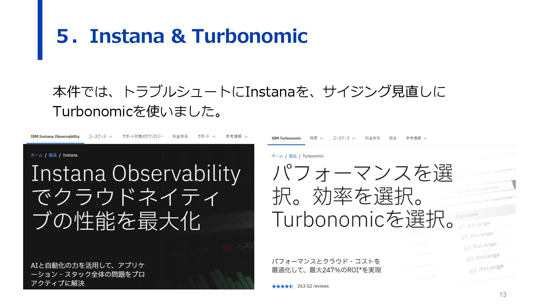 5.Instana & Turbonomic 13 本件では、トラブルシュートにInstanaを、サイジング見直しに Turbonomicを使いました。