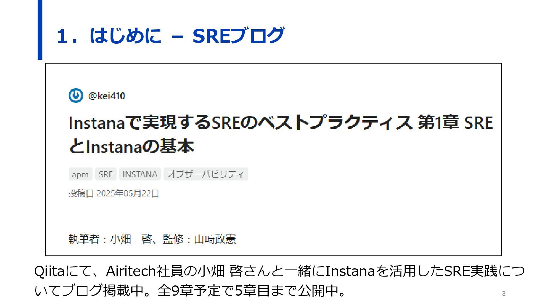 1.はじめに - SREブログ 3 Qiitaにて、Airitech社員の小畑 啓さんと一緒にInstanaを活用したSRE実践につ いてブログ掲載中。全9章予定で5章目まで公開中。