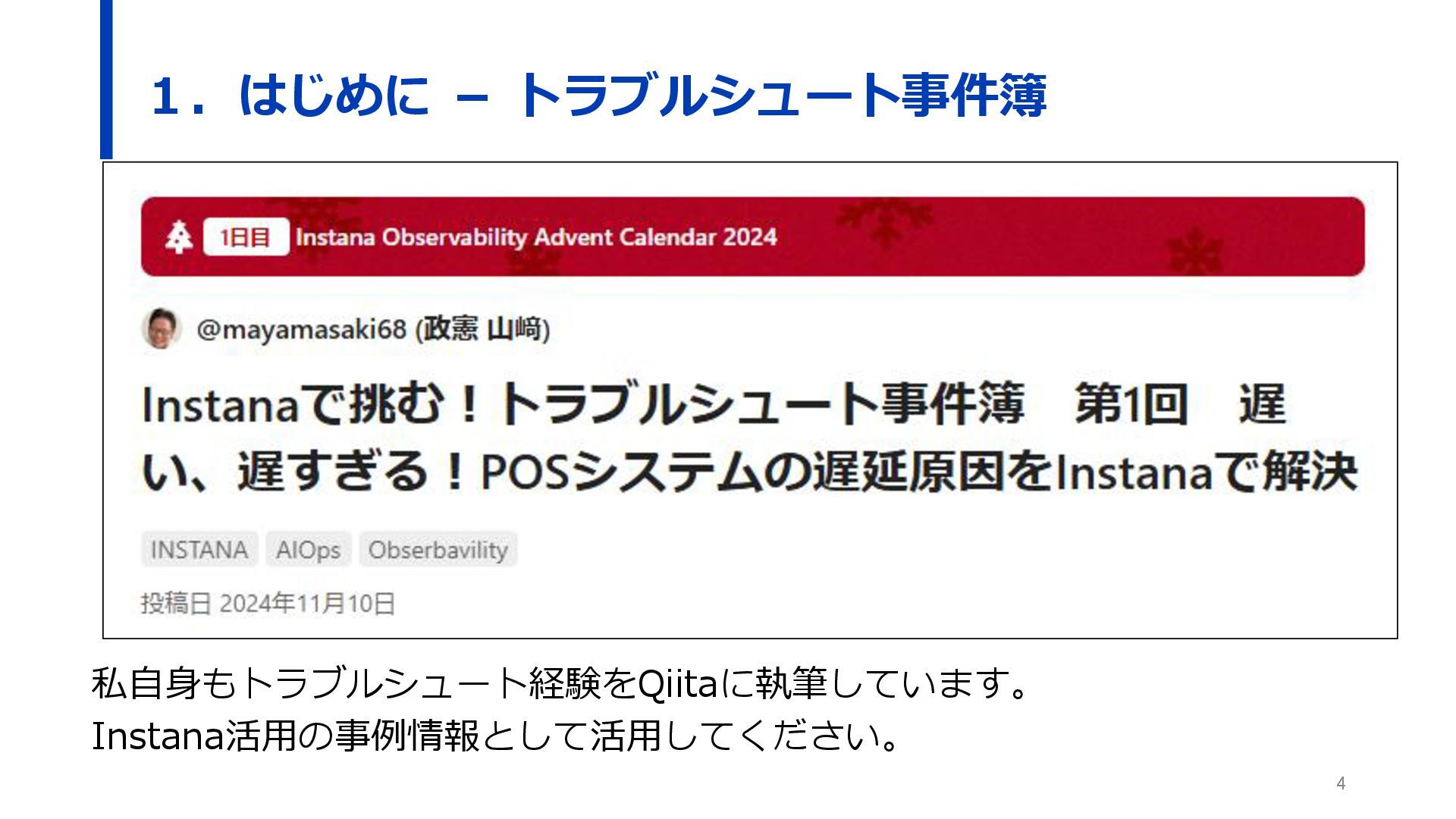 1.はじめに - トラブルシュート事件簿 4 私自身もトラブルシュート経験をQiitaに執筆しています。 Instana活用の事例情報として活用してください。