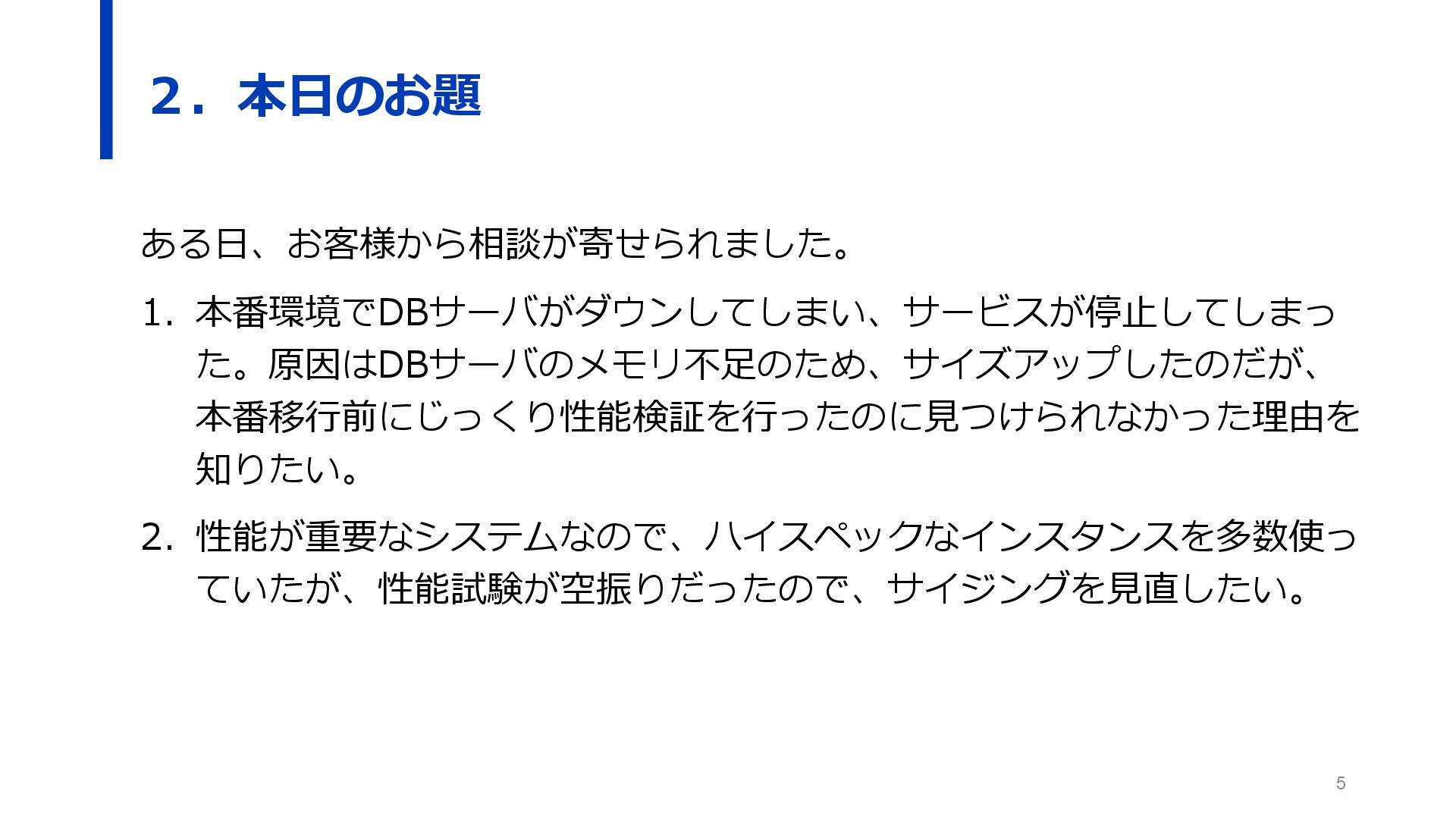 2.本日のお題 5 ある日、お客様から相談が寄せられました。 1. 本番環境でDBサーバがダウンしてしまい、サービスが停止してしまっ た。原因はDBサーバのメモリ不足のため、サイズアップしたのだが、 本番移行前にじっくり性能検証を行ったのに見つけられなかった理由を 知りたい。 2. 性能が重要なシステムなので、ハイスペックなインスタンスを多数使っ