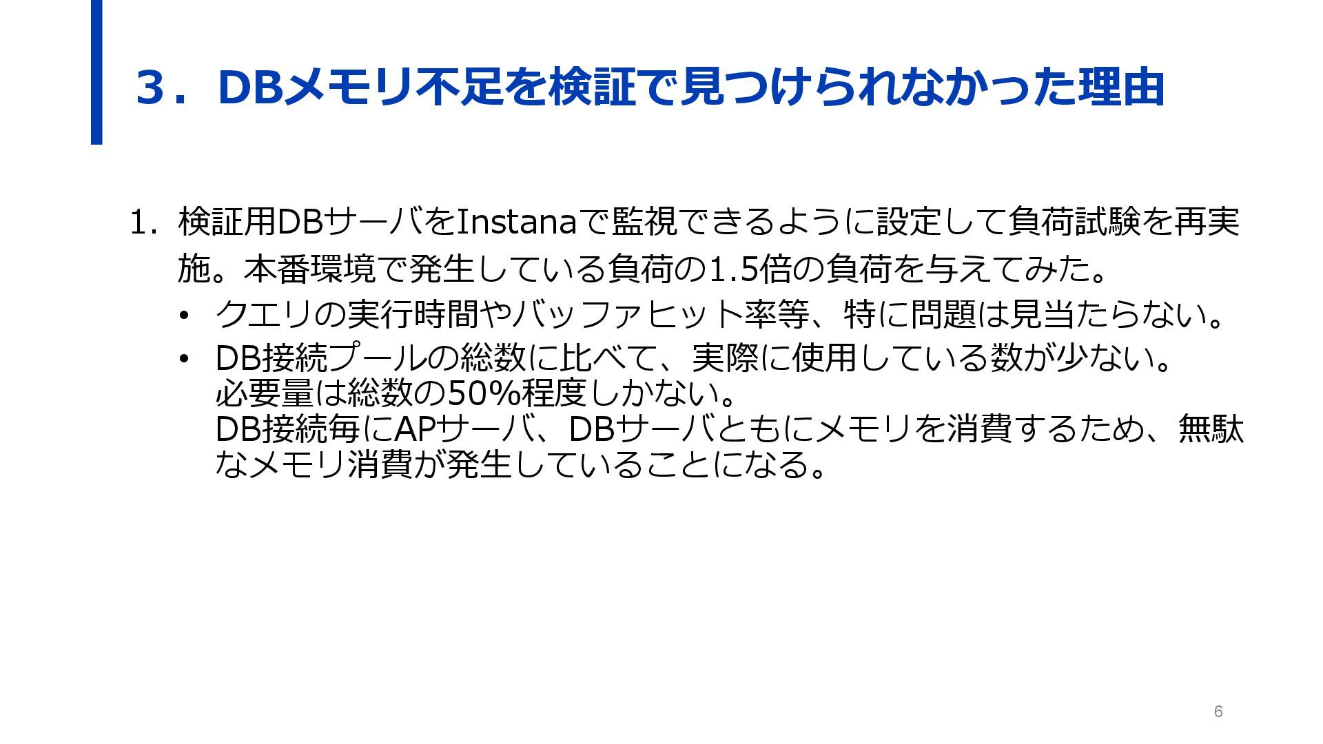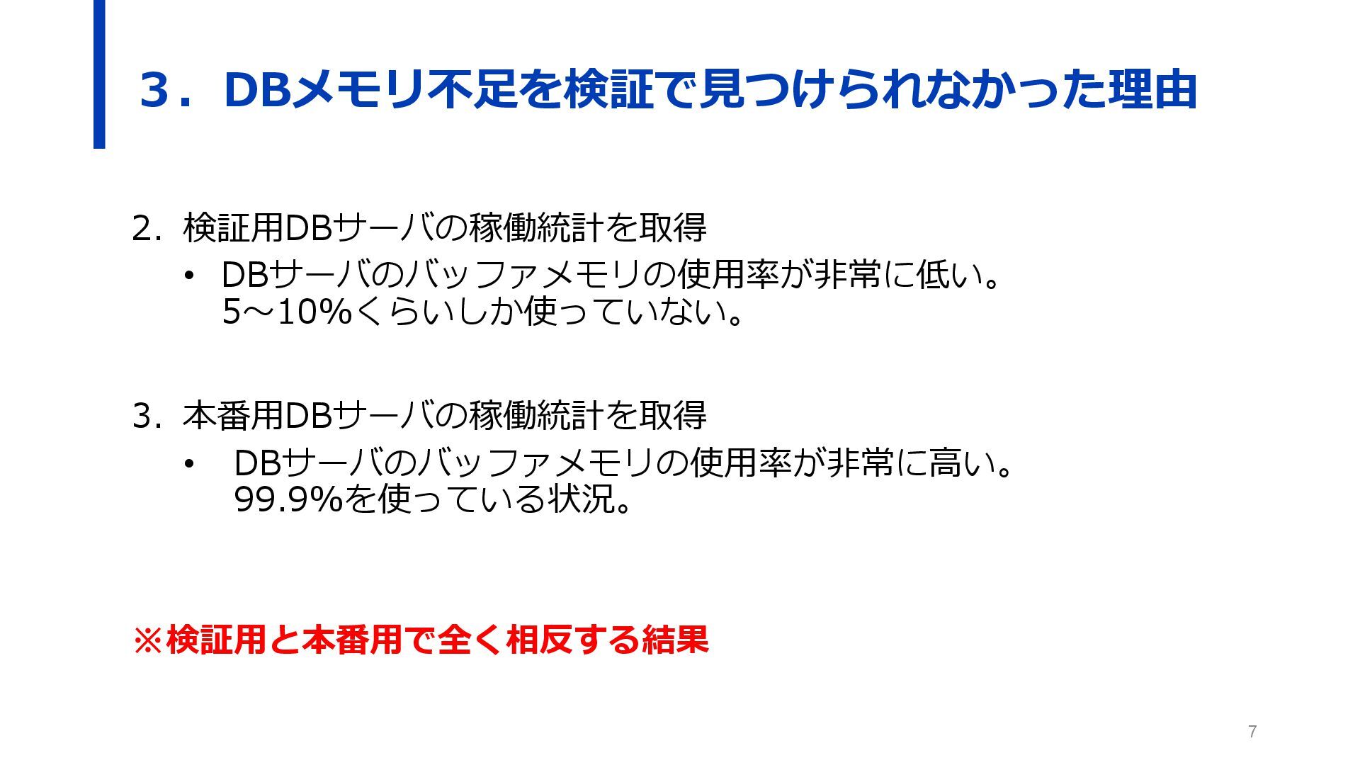 3.DBメモリ不足を検証で見つけられなかった理由 6 1. 検証用DBサーバをInstanaで監視できるように設定して負荷試験を再実 施。本番環境で発生している負荷の1.5倍の負荷を与えてみた。 • クエリの実行時間やバッファヒット率等、特に問題は見当たらない。 • DB接続プールの総数に比べて、実際に使用している数が少ない。 必要量は総数の50%程度しかない。