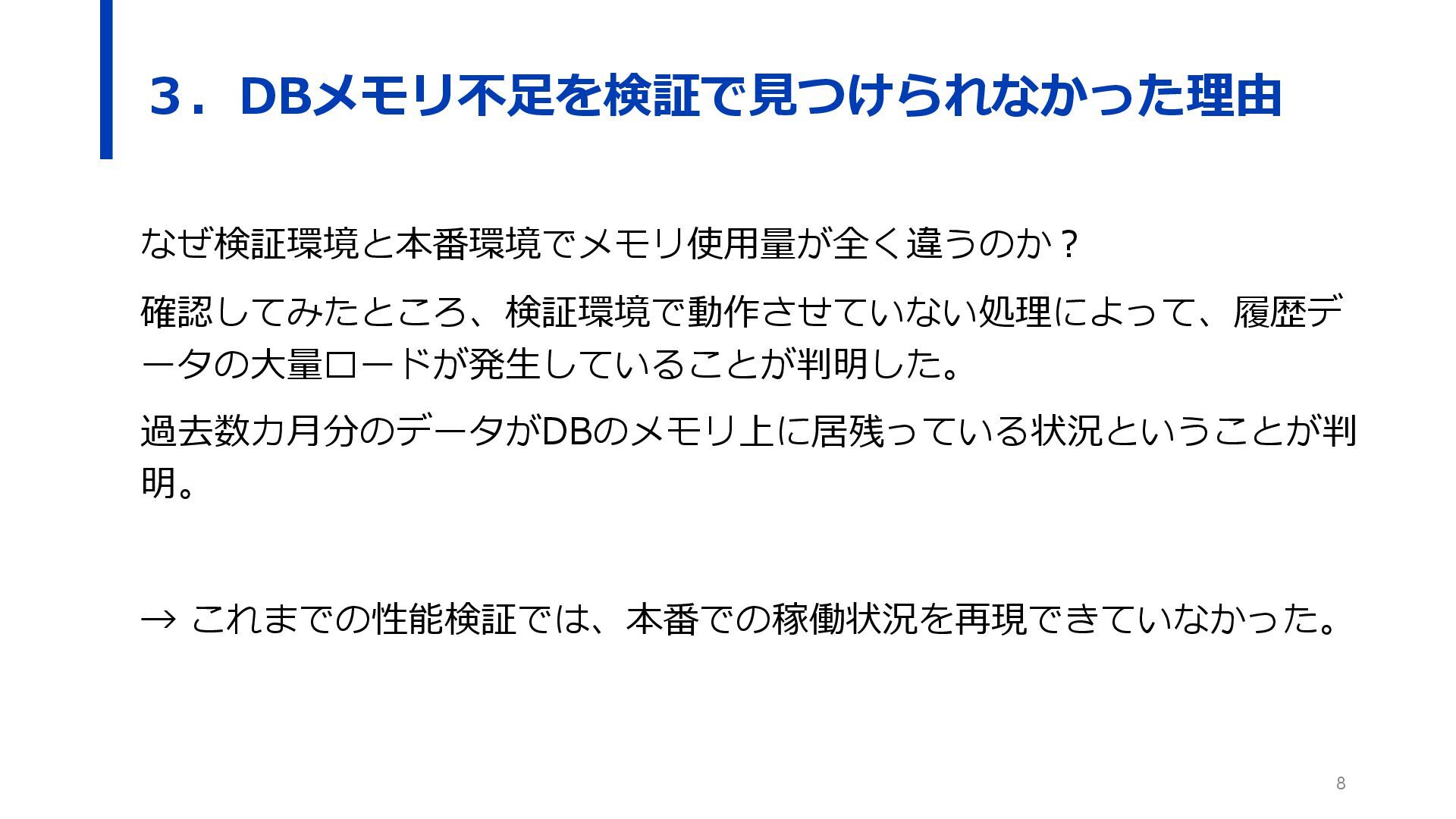 3.DBメモリ不足を検証で見つけられなかった理由 7 2. 検証用DBサーバの稼働統計を取得 • DBサーバのバッファメモリの使用率が非常に低い。 5~10%くらいしか使っていない。 3. 本番用DBサーバの稼働統計を取得 •