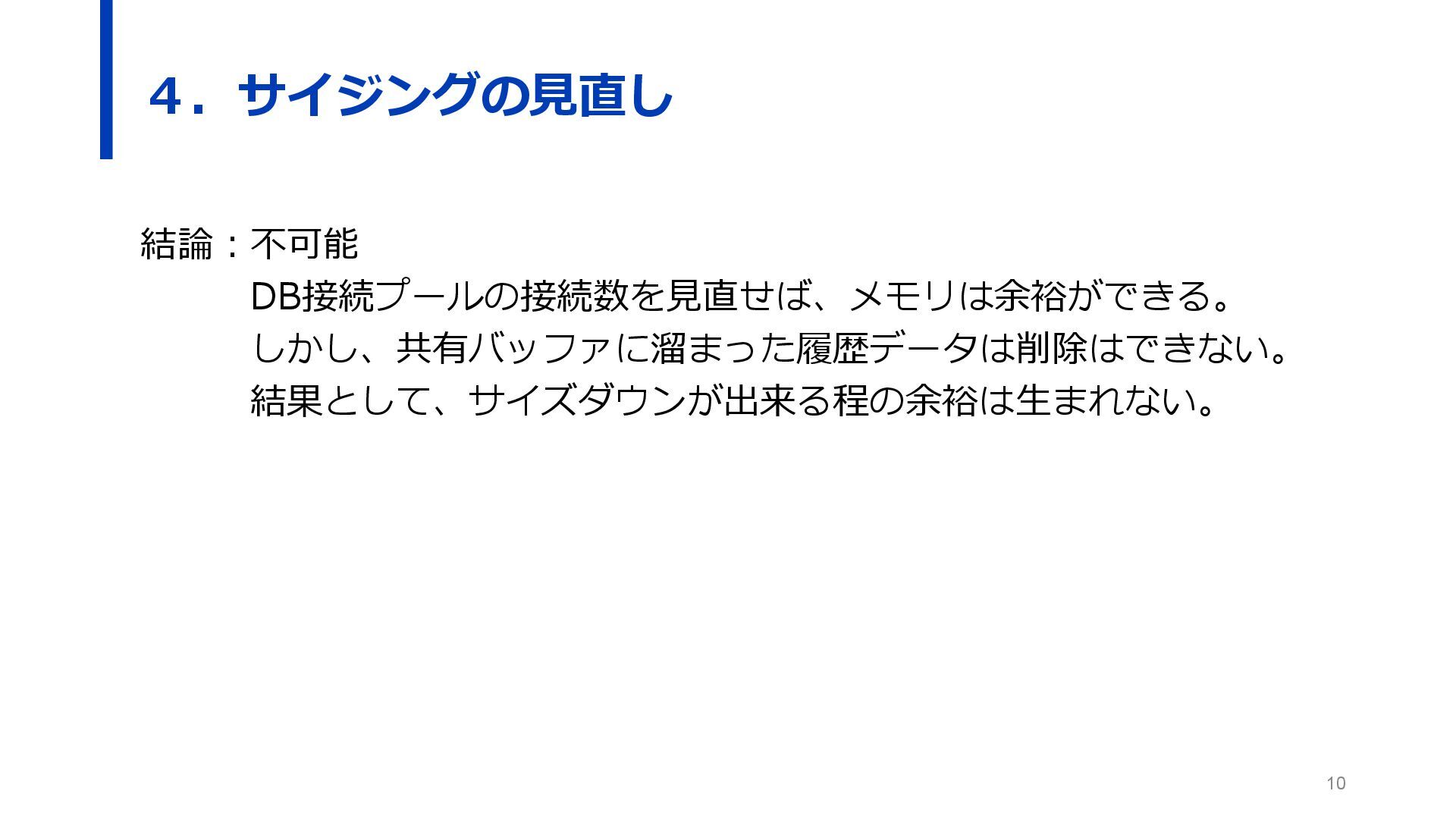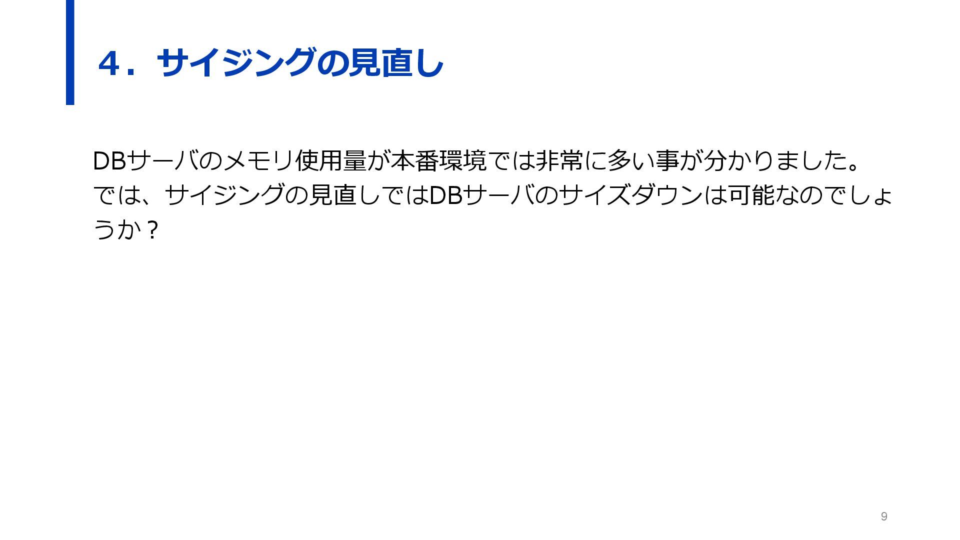 4.サイジングの見直し 9 DBサーバのメモリ使用量が本番環境では非常に多い事が分かりました。 では、サイジングの見直しではDBサーバのサイズダウンは可能なのでしょ うか?