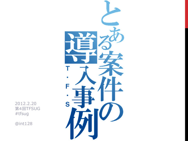 はじめに ※本発表の内容は、私の所属する会社や組織の方針を反映するものではありません。 とある開発プロジェクトでTFSを運用した事例を紹介します。 http://d.hatena.ne.jp/int128/20111221/1324487491