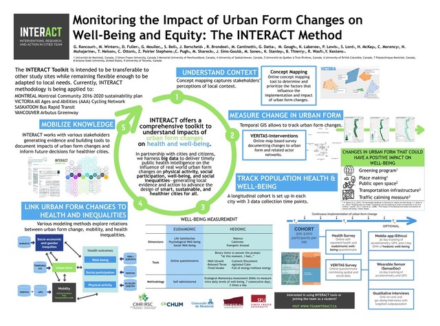 Rancourt G, Winters M, Fuller D, Bell S, Berscheid J, Brondeel R, Cantinotti M, Datta G, Gough M, Laberee K, Lewis P, Lord S, McKay H, Morency C, Muhajarine N, Nelson T, Ottoni C, Poirier Stephens Z, Pugh C, Shareck M, Sims-Gould J, Sones M, Stanley K, Thierry B, Wasfi R, Kestens Y. Monitoring the impact of urban form changes on well-being and inequality: the INTERACT Method. Poster presentation at: American Public Health Association Conference; November 2018; San Diego, CA.