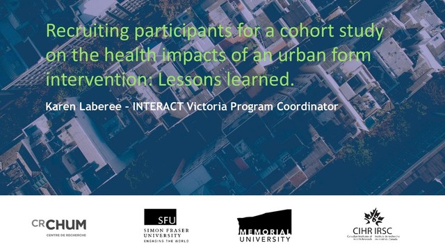 Laberee K, Sones M, Nelson T, Kestens Y, Fuller D, Winters M. Recruiting participants for a cohort study on the health impacts of an urban form intervention: Lessons learned. Oral Presentation at: Canadian Public Health Association Conference; May 2018; Montreal, QC.