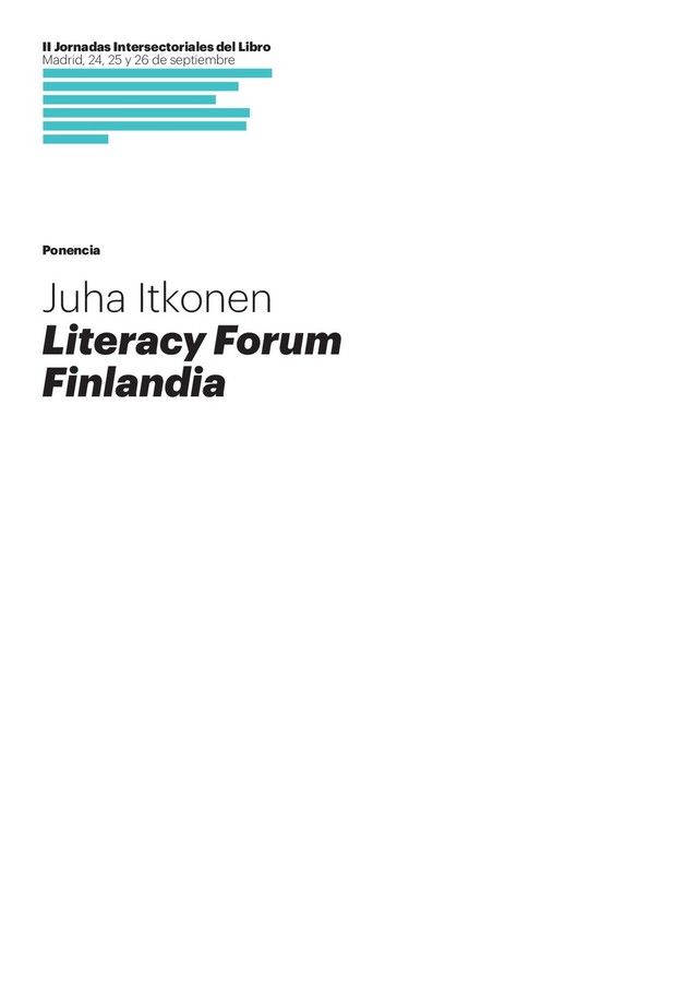 se utiliza en estos momentos, es un término finés que se podría traducir como «competencia lectora múltiple», este es el término que esos catedráticos utilizaban. Por competencia lectora múltiple se referían a que la competencia lectora no está solo dirigida a las palabras sino también a las imágenes, los audios, los símbolos. Este es el entorno en el que crecen los jóvenes. Este es el tipo de texto al que tienen que enfrentarse, y es fundamental que entien- dan todos estos formatos, estas combinaciones de elementos. No obstante, yo diría que en este mundo moderno entender las palabras sigue siendo lo más importante, porque hay tanto audio, tanto ruido, tantas imágenes a las que se enfrentan los jóvenes que de alguna manera creo que van a aprender a interpretar las imágenes y los audios. Pero que pasa con las palabras, con el texto, porque requiere más concentración, requiere más tiempo, así que se pueden saltar esto e ir solo a las imágenes, aunque no quieran, aunque no sea su intención, pero de alguna manera lo hacen, se habitúan, porque es lo más fácil. Por este motivo creo que tenemos que concentrarnos en el texto escrito, en leer texto. No tienen que ser libros necesa- riamente. Por supuesto soy un escritor, escribo novelas, me en- cantan los libros, veo algo muy especial en leer libros que solo sucede de esta manera, leyendo libros. Pero también tengo que admitir que las novelas, la ficción, no son para todo el mundo. Pueden ser un umbral que hay que atravesar. Me gustaría que la gente siguiera leyendo, aunque no quiera leer novela, que lean aquello que les gusta, por ejemplo libros de no ficción, artículos de revistas, en fin, blogs de texto en internet. Lo más importante sería que sea una lectura concentrada, que no sea este modo de scrolear, donde estás leyendo pero no piensas un poco en lo que estás leyendo ni tampoco tienes el goce de la concentración. Una lectura profunda, concentrada, no esta lectura superficial donde vamos de un lado a otro con los ojos. Así pues, lo que se nos pidió fue ofrecer una directrices. Voy a presentároslas. Desde el principio creo que para mi estuvo muy claro, y para el resto de miembros del Foro, que no queríamos solo presentar unas directrices, no queríamos hacer un documen-