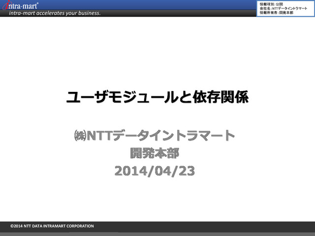 INTRAMART CORPORATION What’s the User Module?? ユーザモジュールの構造 ディレク トリ 想定用途 対象例 generate d 自動生成されたJavaファイルを格納します。 *.java java Javaファイルを格納します。 *.java resource Javaファイル以外でプログラム中に利用す るファイルを格納します。 *.properties、*.xml conf モジュールの動作を制御する設定ファイ ルを格納します。 *.properties、*.xml jssp スクリプト開発用のソースを格納します。 *.html、*.js plugin プラグインとして利用する設定ファイルを 格納します。 *.properties、*.xml public Webコンテンツで静的コンテンツを格納し ます。 *.html、*.css、*.swf 等 schema 設定ファイルに関するXMLスキーマファイ ルを格納します。 *.xsd storage/ public StorageのPublicStorageにて管理される ファイルを格納します。 *.* storageに格納する全ファイ ル storage/s ystem StorageのSystemStorageにて管理される ファイルを格納します。 *.* storageに格納する全ファイ ル webapp Webコンテンツで動的コンテンツを格納し ます。 *.jsp、WEB-INF/に配置するファ イル diconファイル等