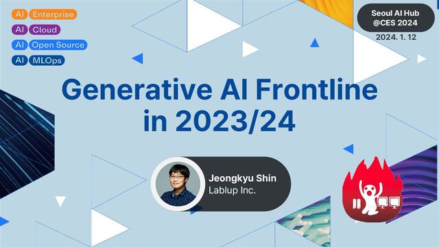 이 발표는 2023년의 Generative AI 의 발전 요소들 및 1년간 시장에서의 관점 변화를 다룹니다. 또한 GenAI 분야에서 기술적, 사회적, 국가적인 경쟁 및 충돌이 벌어지는 부분들을 다룹니다. 하드웨어 및 소프트웨어 분야에 등장한 GenAI 관련 기술 혁신들을 다룬 후, 2024년에 등장할 것으로 보이는 몇가지 변곡점들을 추측해 보고 그에 대한 생각을 나눕니다.