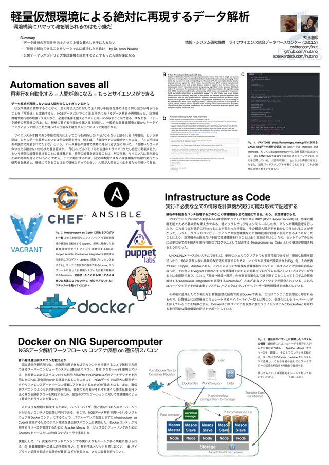 Automation saves all େాୡ ใɾγεςϜݚڀػߏɹϥΠϑαΠΤϯε౷߹σʔλϕʔεηϯλʔ %#$-4 UXJUUFSDPNJOVU HJUIVCDPNJOVUBOP TQFBLFSEFDLDPNJOVUBOP ࠶࣮ߦΛࣗಈԽ͢Δਓָ͕ؒʹͳΔͬͱαΠΤϯε͕Ͱ͖Δ σʔλղੳ͕࠶ݱ͠ͳ͍ͷਓ͕ؒհೖ͍͗ͯ͢͠Δ͔Β ɹঢ়گڥʹґଘ͢Δ͜ͱͳ͘ɼશ͘ಉ͡ೖྗʹରͯ͠શ͘ಉ͡खଓ͖Λ౿Ίશ͘ಉ͡ग़ྗ͕ಘΒΕΔ ͜ͱΛʮ࠶ݱੑʯͱఆٛ͢ΔͱɼNGSσʔλ͚ͩͰͳ͘ੜ໋Պֶʹ͓͚Δσʔλղੳͷ࠶ݱੑͱɼܭࢉػ ڥ࣮ߦऀͷࣝɾεΩϧͳͲɼඞཁͳ݅Λἧ͑ΔίετͱಉҰʹΈͳ͢͜ͱ͕Ͱ͖Δɽ͢ͳΘͪɼʮσʔ λղੳͷ࠶ݱੑͷ্ʯɼղੳʹཁ͢Δ࡞ۀ͔ΒଐਓੑΛഉআ͠ɼҰൠతͳܭࢉػڥͱ͔ᷮͳΩʔλΠ ϐϯάʹΑͬͯಉ͡ग़ྗ͕ಘΒΕΔΈΛཱ֬͢Δ͜ͱʹΑ࣮ͬͯݱ͞ΕΔɽ ɹαΠΤϯεͷຊ࣭Ͱ͋ΓෆஅͷྗʹΑͬͯ͜ΕΛอ࣋͠ͳ͚ΕͳΒͳ͍ͱޠΒΕΔʮ࠶ݱੑʯͱ͍͏୯ ޠɼ͔͠͠σʔλղੳʹ͓͍ͯผͷଆ໘Λ࣋ͭɽྫ͑ɼʮੲࣗͰ͜ͷղੳͬͨΑͳʯʮ͜ͷख๏ ͋ͷจͰ࣮͞ΕͯͨΑͳʯͱ͍͏ɼσʔλղੳͷݱͰසൟʹݟΒΕΔঢ়گʹ͓͍ͯɼʮੲॻ͍ͨίʔυ ࠓͬͨΒಈ͔ͳ͍͔Β·ͨॻ͖͔͢ʯʮࢼ͠ʹϏϧυͯ͠ΈͨΒṖͷΤϥʔͰίέͨࣗ͠Ͱ࣮͢Δ͔ʯ ͱ͍͏࣌ؒͷ࿘අΛආ͚Δ͜ͱʹܨ͕Δɽ࣌ؒͷ࿘අΛආ͚Δ͜ͱɼผͷ࡞ۀɼαΠΤϯεʹऔΓΉ ͨΊͷ࣌ؒΛಘΔͱ͍͏͜ͱͰ͋Δɽ͜͜Ͱհ͢Δͷɼݚڀͷຊ࣭Ͱͳ͍ڥߏஙॲཧͷ࣮ߦ͔Β ݚڀऀΛղ์͠ɼػցʹͰ͖Δ͜ͱશͯػցʹͬͯΒ͍ɼਓ͕ؒਓؒΒ͘͠ੜ͖ΔͨΊͷઓ͍Ͱ͋Δɽ Infrastructure as Code ࣮ߦʹඞཁͳશͯͷใΛܭࢉػ͕࣮ߦՄೳͳܗࣜͰهड़͢Δ ղੳͷखଓ͖Λόονॲཧ͢Δ͔ͷ͝ͱ͘ڥߏஙશͯࣗಈԽͰ͖Δɽͦ͏ɼԾڥͳΒͶɽ ɹϓϩάϥϛϯάʹ͓͚Δඒֶ͋Δֶ͍ͷ1ͭͱͯ͠ΒΕΔ DRY (Don’t Repeat Yourself) ɼ࡞ۀͷॏ ෳΛ͙ͨΊͷجຊతͳߟ͑ํͰ͋ΔɽಛʹιϑτΣΞΛΠϯετʔϧͨ͠ΓɼϚγϯͷڥઃఆΛߦͬ ͨΓɼ͜Ε·ͰରతʹߦΘΕΔ͜ͱ͕ଟ͔ͬͨ࡞ۀɼͦͷਓ͕ؒखΛಈ͔ͯ͠ߦΘΕΔ͜ͱ͕ଟ ͔ͬͨɽ͔͠͠ɼάϦουίϯϐϡʔςΟϯάԾڥͳͲͷใٕज़͕༰қʹར༻Ͱ͖ΔΑ͏ʹͳͬͨ ͜ͱʹΑΓɼܭࢉػͷ͚ͩखಈͰڥߏஙΛߦ͏͜ͱશ͘ݱ࣮తͰͳ͍ͨΊɼηοτΞοϓͷͨΊ ʹඞཁͳશͯͷखଓ͖Λ࣮ߦՄೳͳϓϩάϥϜͱͯ͠هड़͢Δ Infrastructure as Code ͱ͍͏֓೦͕ఏএ͞Ε ΔΑ͏ʹͳͬͨɽ ɹUNIX/LINUXϕʔεͷγεςϜͰ͋Εɼ୯७ͳγΣϧεΫϦϓτͰ࣮ݱՄೳͰ͋Δ͕ɼෳࡶͳॲཧΛه ड़ͨ͠ΓɼOSʹґଘ͠ͳ͍நతͳهड़Λ࣮ݱ͢ΔͨΊʹɼ͍͔ͭ͘ͷٕज़͕ఏএ͞Εͨ(Fig. 2)ɽͦͷද ͕Chef, Puppet, AnsibleͰ͋Δɽ͜ΕΒʹΑͬͯେنͳܭࢉػ܈Λίϯτϩʔϧ͢Δ͜ͱ͕ඇৗʹ༰қʹ ͳͬͨɽͦͷଞʹVagrantΛ࢝Ίͱ͢ΔԾڥͦͷͷͷىಈΛϓϩάϥϜʹམͱ͜͠ΉϓϩμΫτ͕ࠓ ·͞ʹશظͰ͋Γɺ͜Εʹʮ࣮ˠݕূˠӡ༻ʯͷ࡞ۀΛࣗಈԽͯ͠܁Γฦ͢͜ͱʹΑͬͯγεςϜͷ࣭Λ ҡ࣋͢Δ”Continuous Integration”Λ࣮ݱ͢ΔJenkinsͳͲ, ͞·͟·ͳιϑτΣΞ͕։ൃ͞Ε͍ͯΔɽ͜ΕΒ ϋʔυΣΞͰͦͷ··ಈ͘γεςϜ (ϕΞϝλϧ) ϋΠύʔόΠβʔܕԾڥΛରͱ͍ͯ͠Δɽ ɹͦͷޙʹొͨ͠ͷ͕৽ͨͳܭࢉػԾԽٕज़Ͱ͋ΔDockerͰ͋Δɽ͜ΕίϯςφܕԾԽͱݺΕΔ ͷͰɼܭࢉػ্ʹܭࢉػΛΤϛϡϨʔτ͢ΔϋΠύʔόΠβʔܕͱҟͳΓɼԾԽʹΑΔΦʔόʔϔου Λ͍͑ͯΔ͜ͱΛಛͱ͢ΔɽDocker͜ͷίϯςφܕԾʹࠩϑΝΠϧγεςϜͱDockerfileͱݺΕ Δ࣮ߦՄೳͳڥߏஙͷهड़Λαϙʔτ͍ͯ͠Δɽ Docker on NIG Supercomputer /(4σʔλղੳϫʔΫϑϩʔWTίϯςφԾPOҨݚεύίϯ ੨͍ܵҨݚεύίϯΛٹ͑Δ͔ ɹࠃཱҨֶݚڀॴͰɼඇ༻ར༻Ͱ͋ΕΞΧϯτΛਃ͢Δ͜ͱͰແྉͰར༻ Ͱ͖ΔεʔύʔίϯϐϡʔλγεςϜ(ҨݚεύίϯɼѪশ:ΓͳͪΌΜ)Λӡ༻͍ͯ͠ Δɽଞʹ͓͚Δεύίϯͷओͳར༻ํ๏͕MPIGPGPUͳͲͷΞʔΩςΫνϟΛར ༻ͨ͠CPUʹߴෛՙͷ͔͔ΔܭࢉͰ͋Δ͜ͱʹରͯ͠ɼNGSσʔλͰڊେͳྻσʔ λϦϑΝϨϯεσʔλϕʔεʹසൟʹΞΫηε͢ΔͨΊI/O͕ͱͳΔɽ·ͨɼҨ ݚεύίϯͷΑ͏ͳڞಉར༻ܕͷ߹ɼෳͷར༻ऀ͕ͦΕͧΕ༷ʑͳཁٻ༷Λ࣋ͭ શ͘ҟͳΔղੳϑϩʔΛ࣮ߦ͢ΔͨΊɼݸผͷΞϓϦέʔγϣϯʹରͯ͠ڥߏஙʹΑͬ ͯ࠷దԽΛߦ͏͜ͱ͕͍͠ɽ ɹ͜ͷΑ͏ͳΛղܾ͢ΔͨΊʹɼϋΠύʔόΠβʔܕͱҟͳΓI/OͷΦʔόʔϔο υ͕গͳ͍ίϯςφܕԾ༗རͰ͋Δɽͦ͜ͰɼNGSσʔλղੳͰ༻͍ΒΕΔιϑτ ΣΞΛDockerίϯςφʹ͢Δ͜ͱͰɼύϑΥʔϚϯεΛམͱͣ͞ʹInfrastructure as CodeΛ࣮ݱ͢ΔͨΊͷςετڥΛҨݚεύίϯ্ʹߏஙͨ͠ɽDockerίϯςφ͕ར ༻͢ΔϦιʔεΛཧ͢ΔͨΊʹ Apache Mesos ΛɼδϣϒεέδϡʔϦϯάͷͨΊʹ Chronos Λϕʔεͱͨ͠ಠࣗεέδϡʔϥΛ࣮ͨ͠ɽ ՝ͱͯ͠ɼ1) ैདྷͷάϦουΤϯδϯͰͷ࣮ߦΑΓϧʔϧ͕ଟ͘ࡶʹײ͡ΒΕ Δɼ2) ܭࢉػڥͷಋೖͷख͕ؒଟ͍ɼ3) Ҡߦ͢ΔϝϦοτΛײ͡ʹ͍͘ɼ 4) ύΠ ϓϥΠϯॲཧΛهड़͢Δ෦͕ශऑ ͳͲ͕͋ΔͨΊɼ͞ΒʹվળΛߦ͍ͬͯ͘ɽ Mesos Slave Mesos Slave Mesos Slave workflow manager Node Storage %PDLFSGJMFT 8PSLGMPXKTPO %BUB 1VTI%PDLFSGJMFTUP $POUBJOFS3FHJTUSZ Node Node Node Node Mesos Master Mesos Slave 1VTIXPSLGMPX DPOGJHVSBUJPOUPNBOBHFS 5SBOTGFS%BUB WJBJOUFSOFU 1VMMDPOUBJOFS3VO .PVOU%BUB%JSUPDPOUBJOFS 1BTTFYFDVUFS VTFS Fig. 1. FANTOM5 (http://fantom.gsc.riken.jp/5/)ʹ͓͚Δ CAGE-Seqσʔλղੳͷهड़ (a) จதͰ Materials and Methods, ͘͠SupplementaryதʹࣗવݴޠͰهड़͞Ε Δɽ (b) FANTOM5ͰจͱผʹΦϯϥΠϯͰϓϩτί ϧΛެ։͍ͯ͠Δɽେม༗Γ͍ɽ (c) ͔͠͠࠶࣮ߦ͢Δͱ ͳΔͱɼ݁ہόονεΫϦϓτΛॻ͘͜ͱʹͳΔɽ͜Ε͕ จʹఴ͞Ε͍ͯͯཉ͍͠ɽ a b c Fig. 2. Infrastructure as Code ʹؔΘΔϓϩμΫ τҰཡ ࠨ͔Β࣌ܭճΓʹ ϋΠύʔόΠβܕԾ ڥͷߏஙΛࣗಈԽ͢ΔVagrant, ৽نʹՔಇͨ͠ܭ ࢉػڥͷηοτΞοϓΛࣗಈԽ͢ΔChef, Puppet, Ansible, Continuous IntegrationΛ࣮ݱ͢Δ දతͳϓϩμΫτ Jenkins (௨শδΣϯΩϯε͓ ͡͞Μ), ίϯςφܕԾͷضखͰ͋Δdocker, ςϯ ϓϨʔτʹैͬͨܭࢉػγεςϜΛࣗಈͰՔಇ͞ ͤΔTerraformɽશ෦ͬͨ͜ͱ͋Δ/ͬͯΔਓ ͥͻ͓༑ୡʹͳΓ͍ͨͷͰɼͥͻϦΞϧ͍͍Ͷʂ εςοΧʔΛష͍ͬͯͩ͘͞ʂ Fig. 3. Ҩݚεύίϯ্ʹߏஙͨ͠γεςϜ ͷ֓ཁ ҨݚεύίϯͷϊʔυΛطଘγες Ϝ͔ΒΓ͠ɼ Apache Mesos ͰϦ ιʔεΛ ཧ͠ɼͦͷ