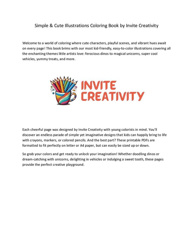Each coloring page in this book was designed by Invite Creativity with young colorists in mind. You'll discover an endless amount of simple yet imaginative designs that kids can happily bring to life with crayons, markers, or colored pencils. These printable PDFs are formatted to fit perfectly on letter or A4 paper, but can easily be sized up or down.