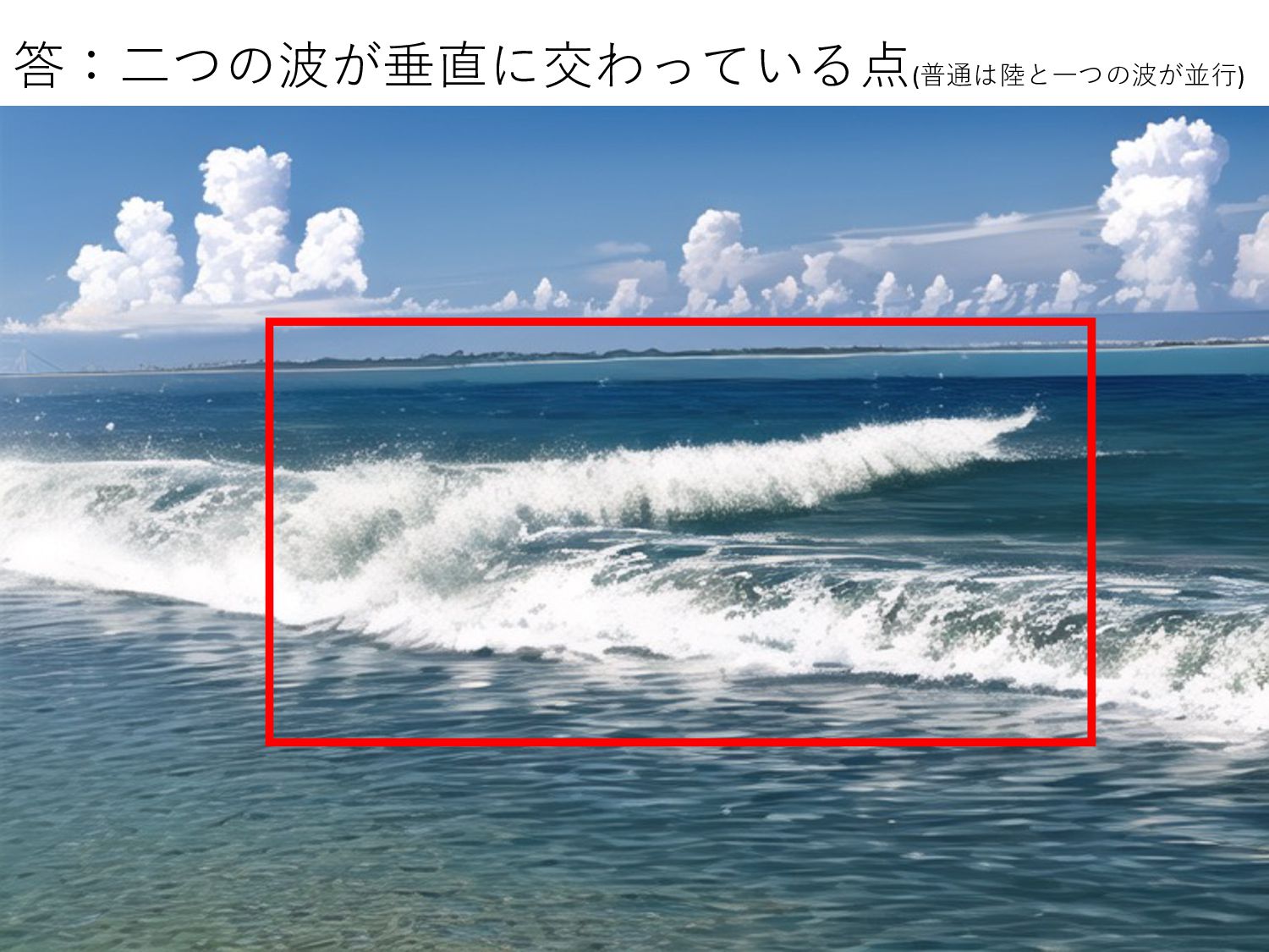 答:⼆つの波が垂直に交わっている点(普通は陸と⼀つの波が並⾏)