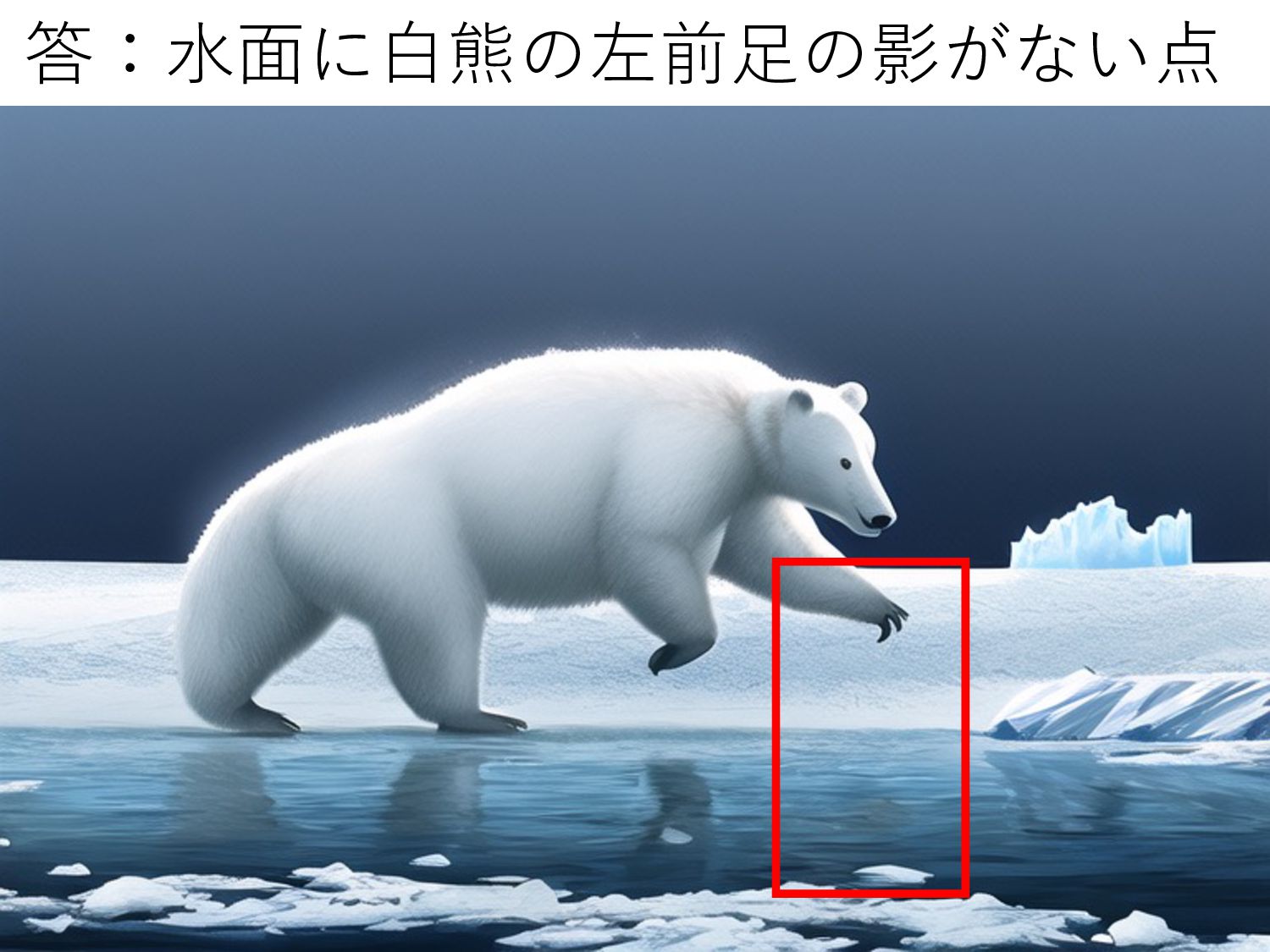 答:⽔⾯に⽩熊の左前⾜の影がない点