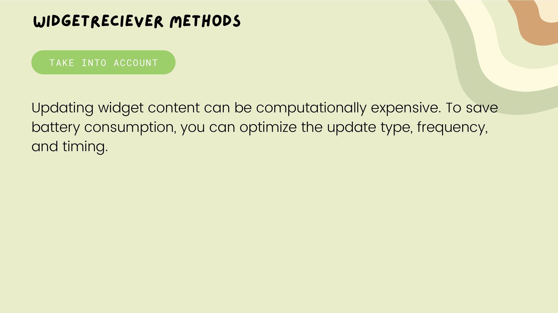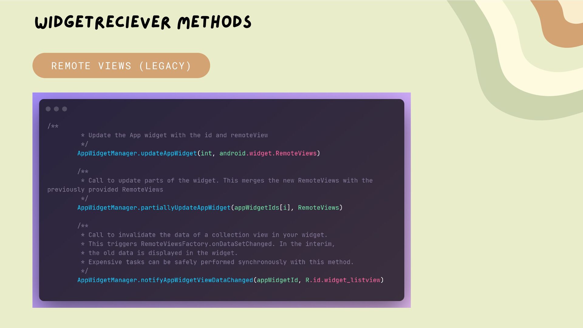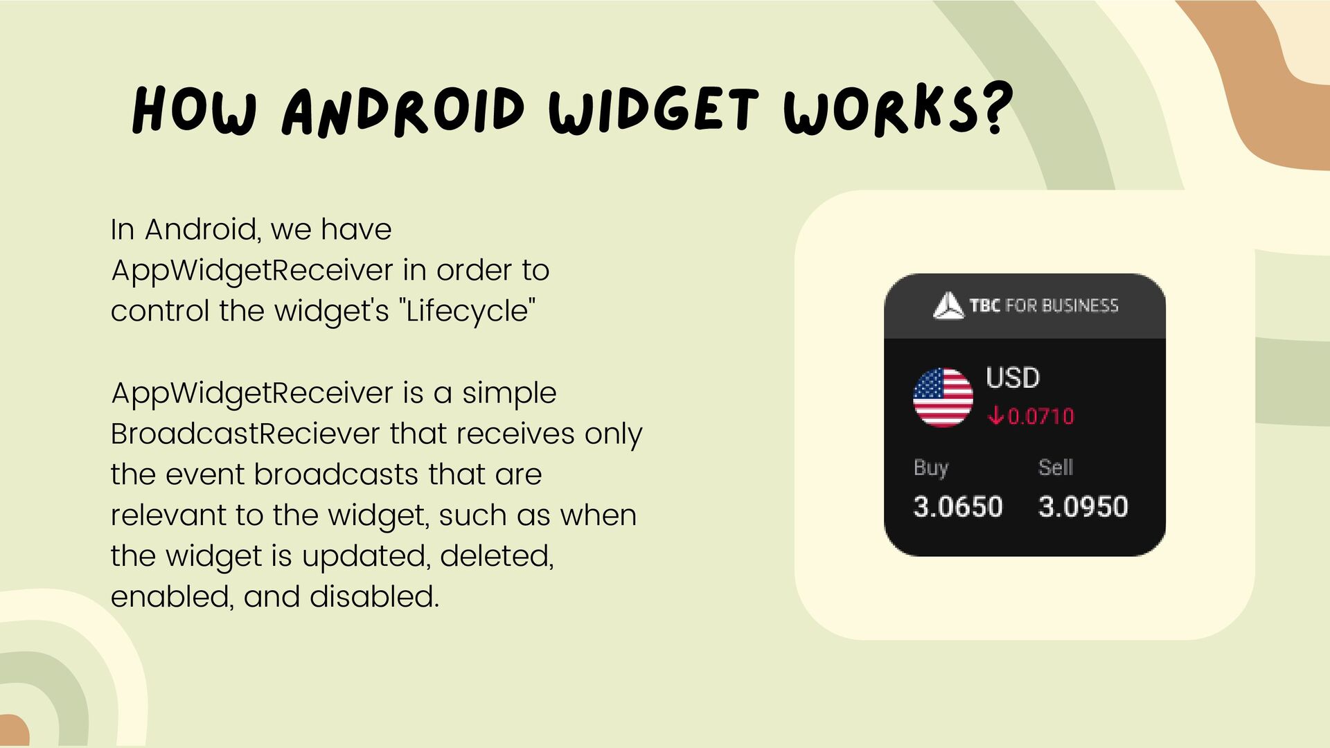 widget's "Lifecycle" AppWidgetReceiver is a simple BroadcastReciever that receives only the event broadcasts that are relevant to the widget, such as when the widget is updated, deleted, enabled, and disabled. How Android Widget Works?