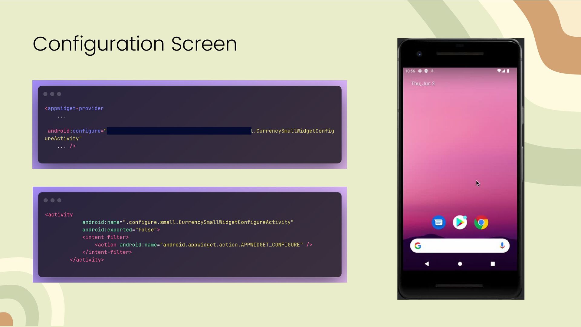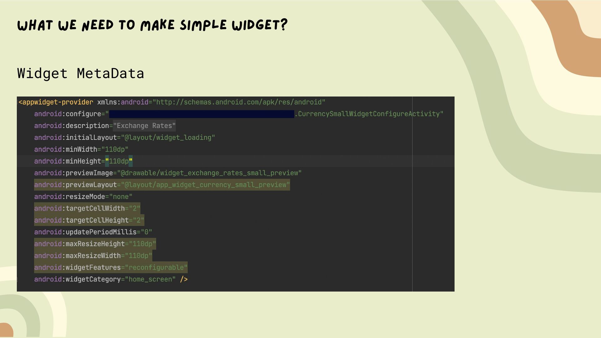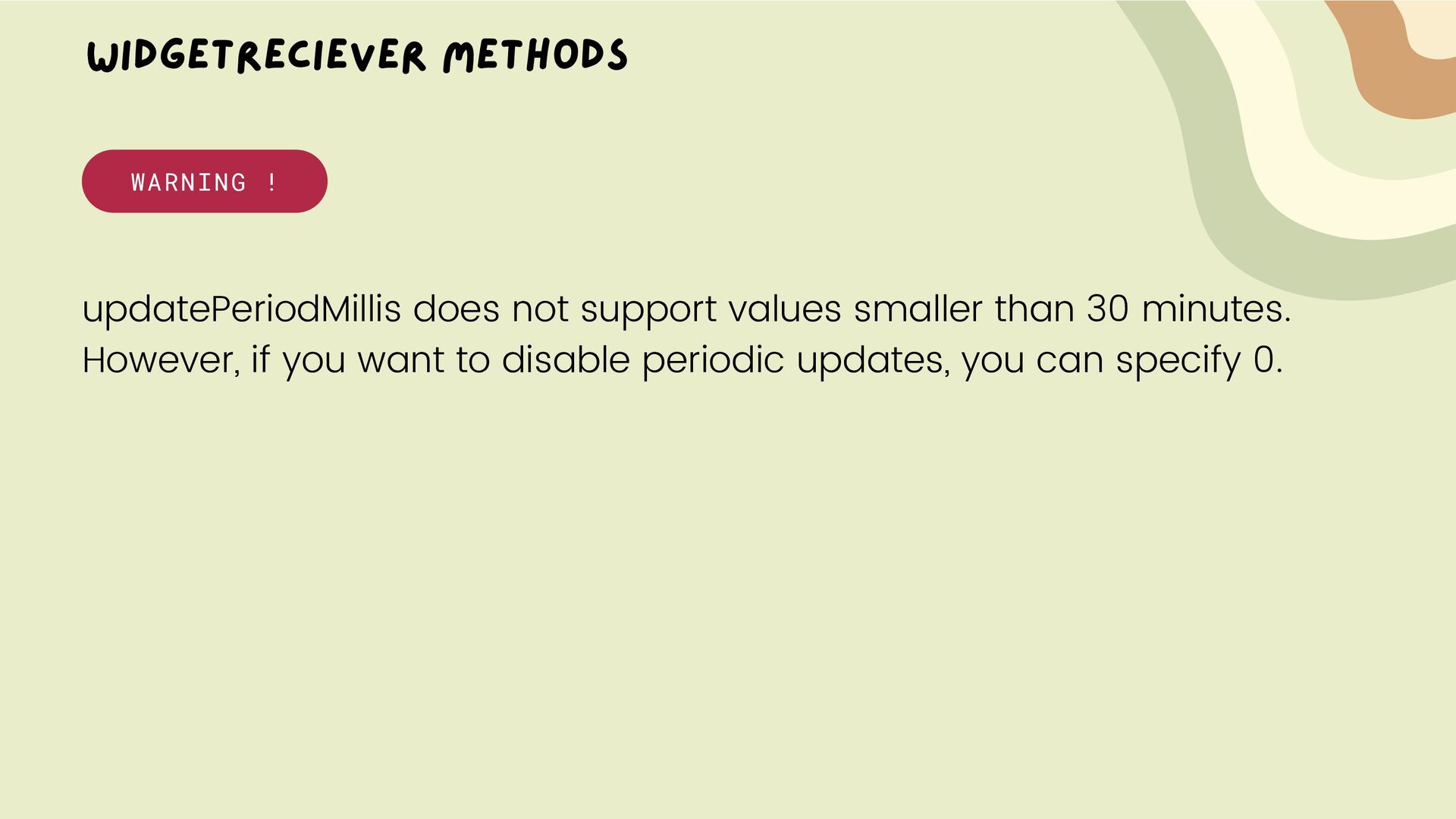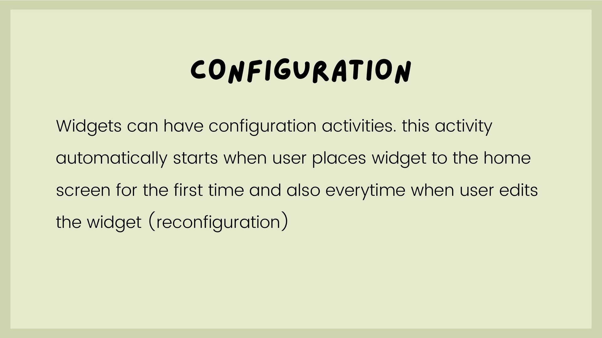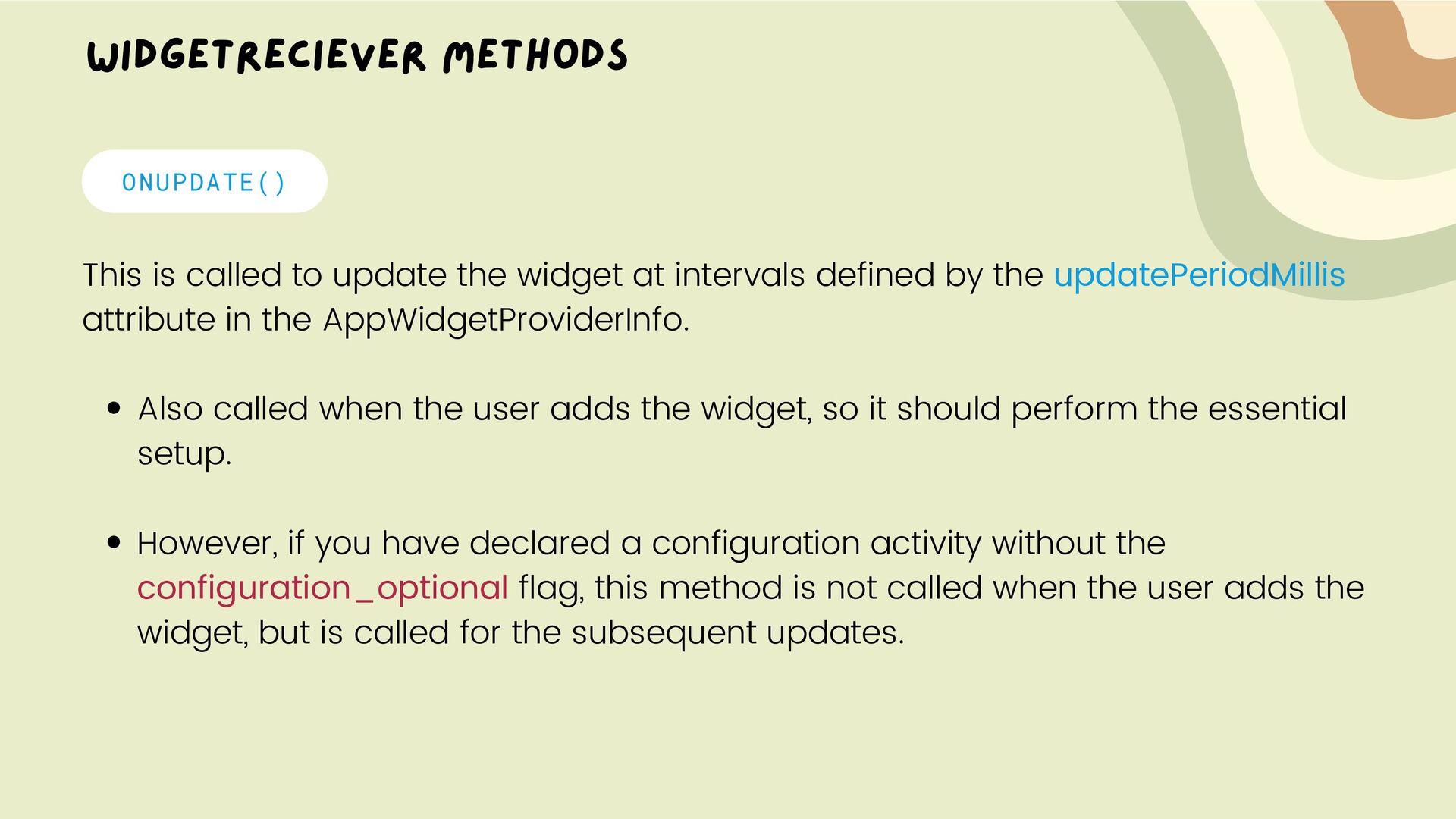 widget, so it should perform the essential setup. However, if you have declared a configuration activity without the configuration_optional flag, this method is not called when the user adds the widget, but is called for the subsequent updates. This is called to update the widget at intervals defined by the updatePeriodMillis attribute in the AppWidgetProviderInfo.