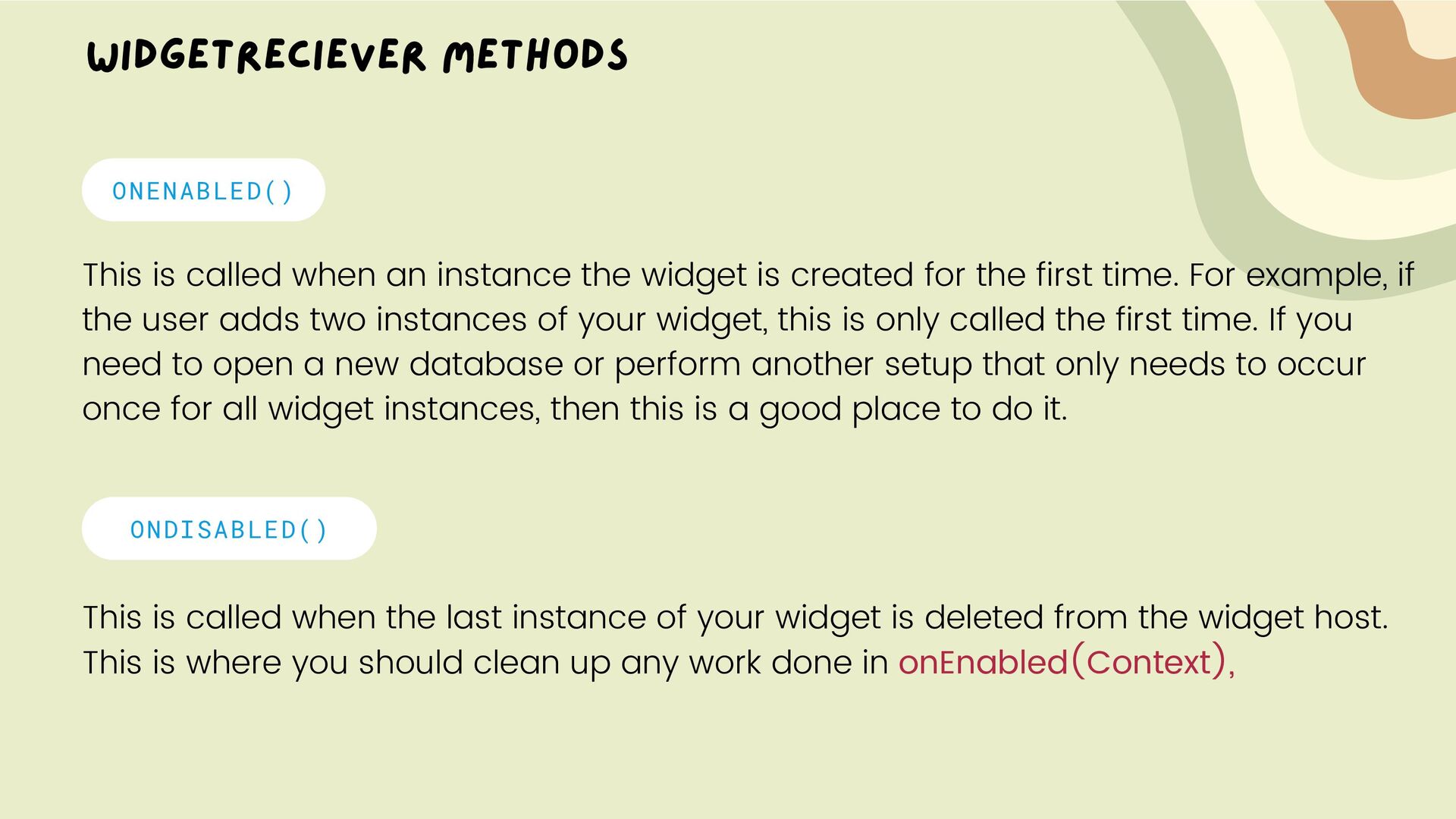 widget is created for the first time. For example, if the user adds two instances of your widget, this is only called the first time. If you need to open a new database or perform another setup that only needs to occur once for all widget instances, then this is a good place to do it. ONDISABLED() This is called when the last instance of your widget is deleted from the widget host. This is where you should clean up any work done in onEnabled(Context),