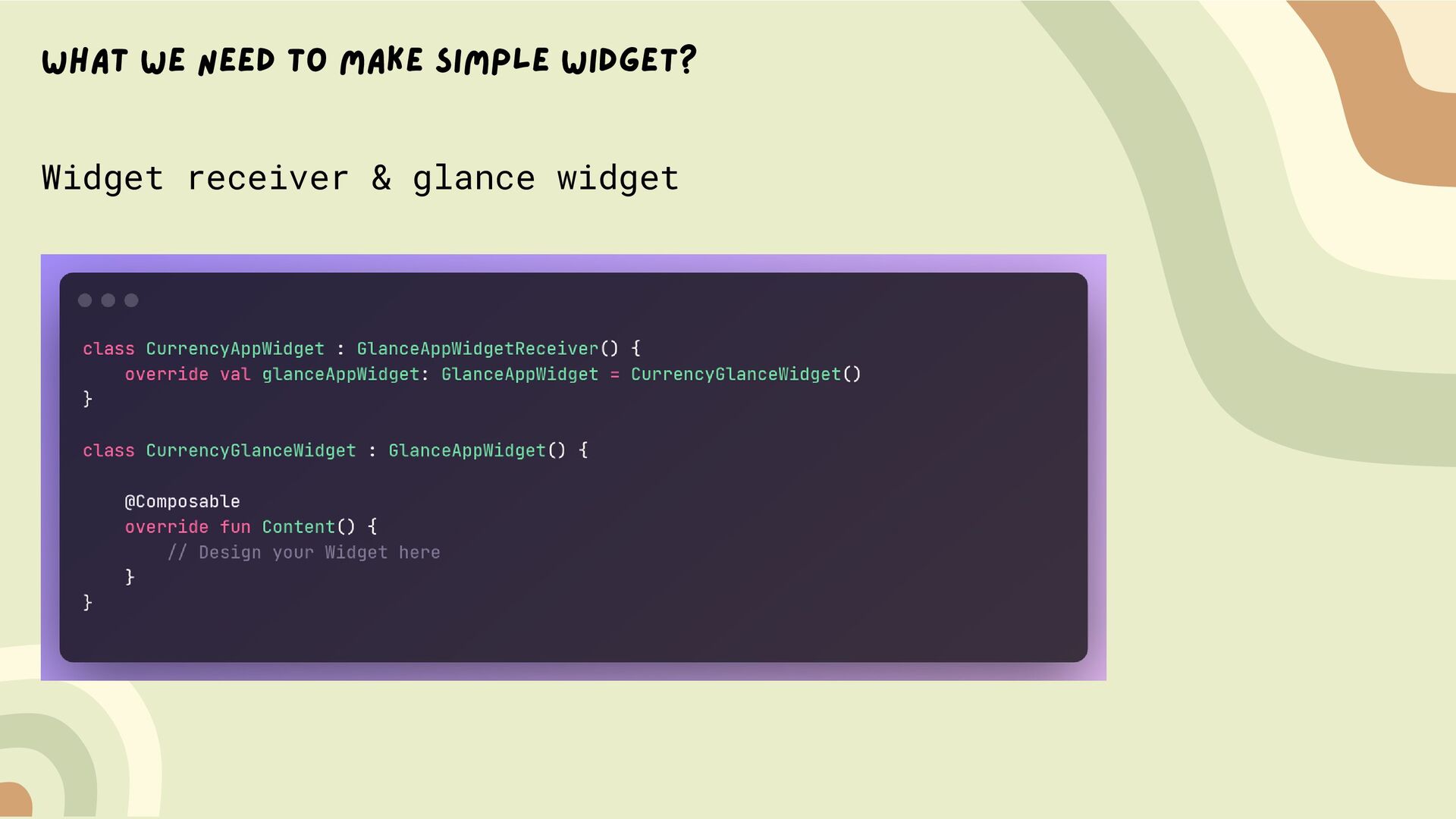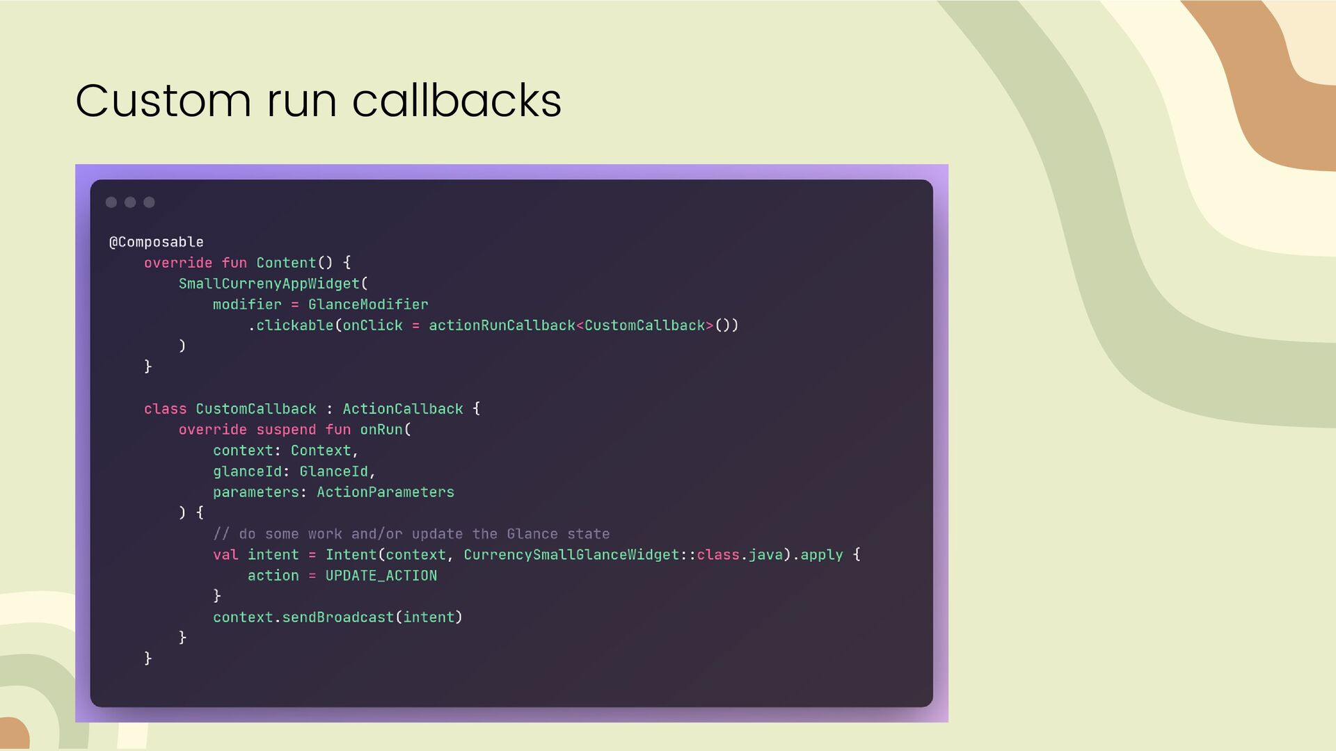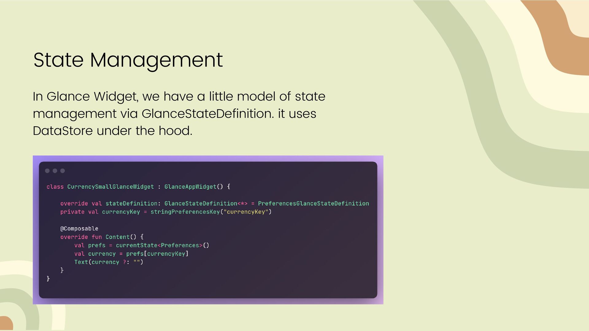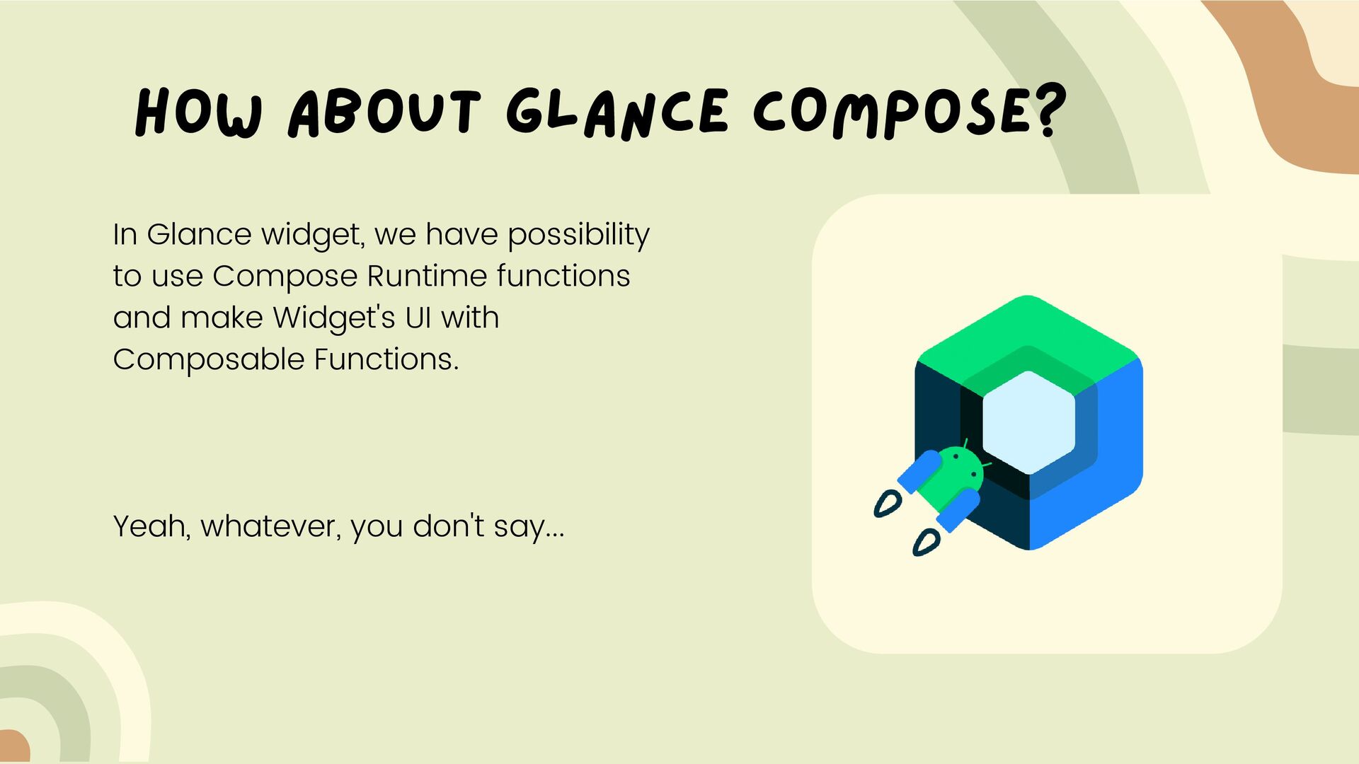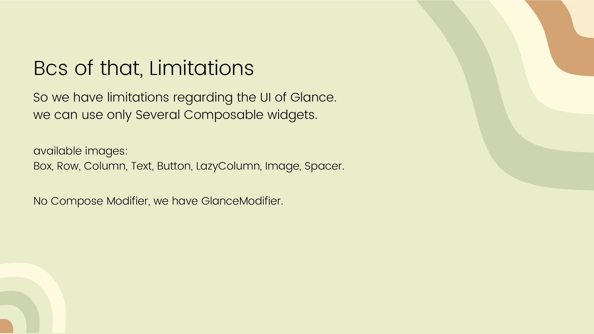 and testing is a pain in the ass No Remote Image Loading the minSDK is 21, we are currently only supporting compatibility till SDK v23. widget round corner support for <SDK 23 NO ROUND CORNERS updating the glance widget is possible only with coroutines