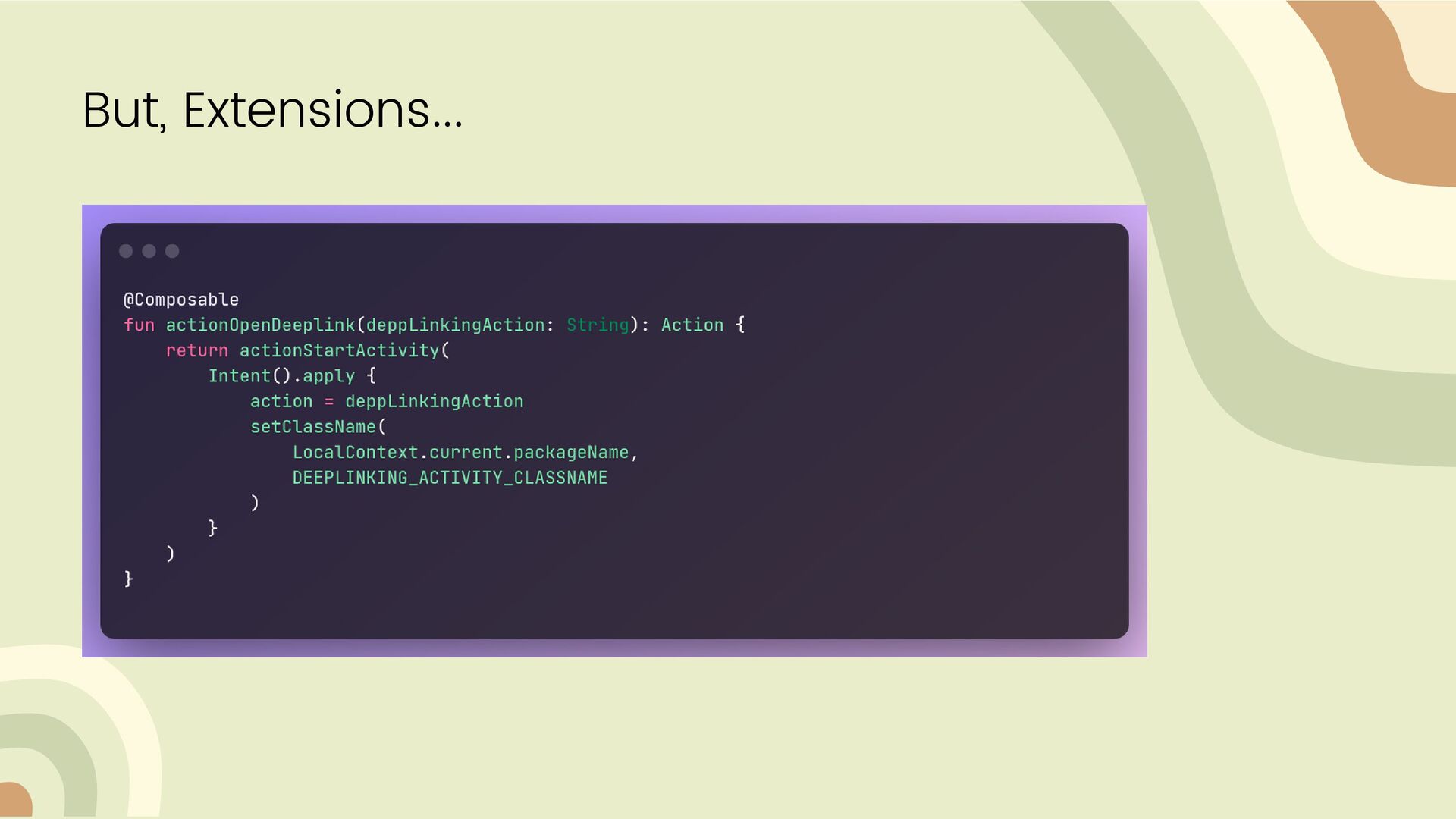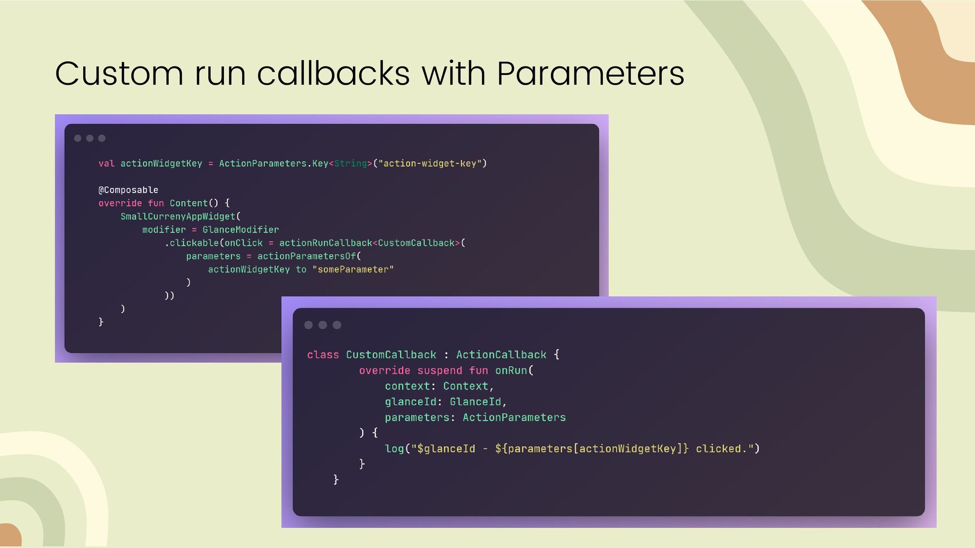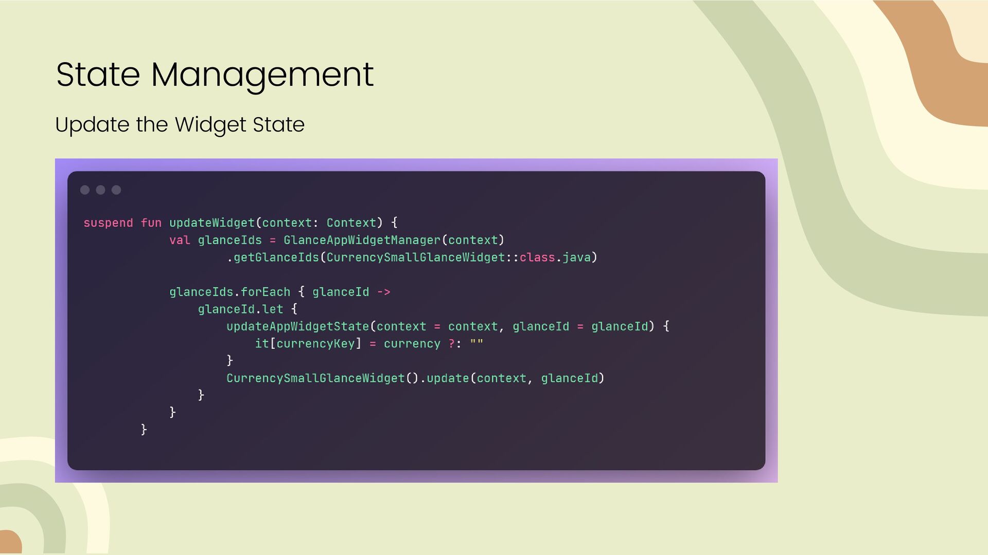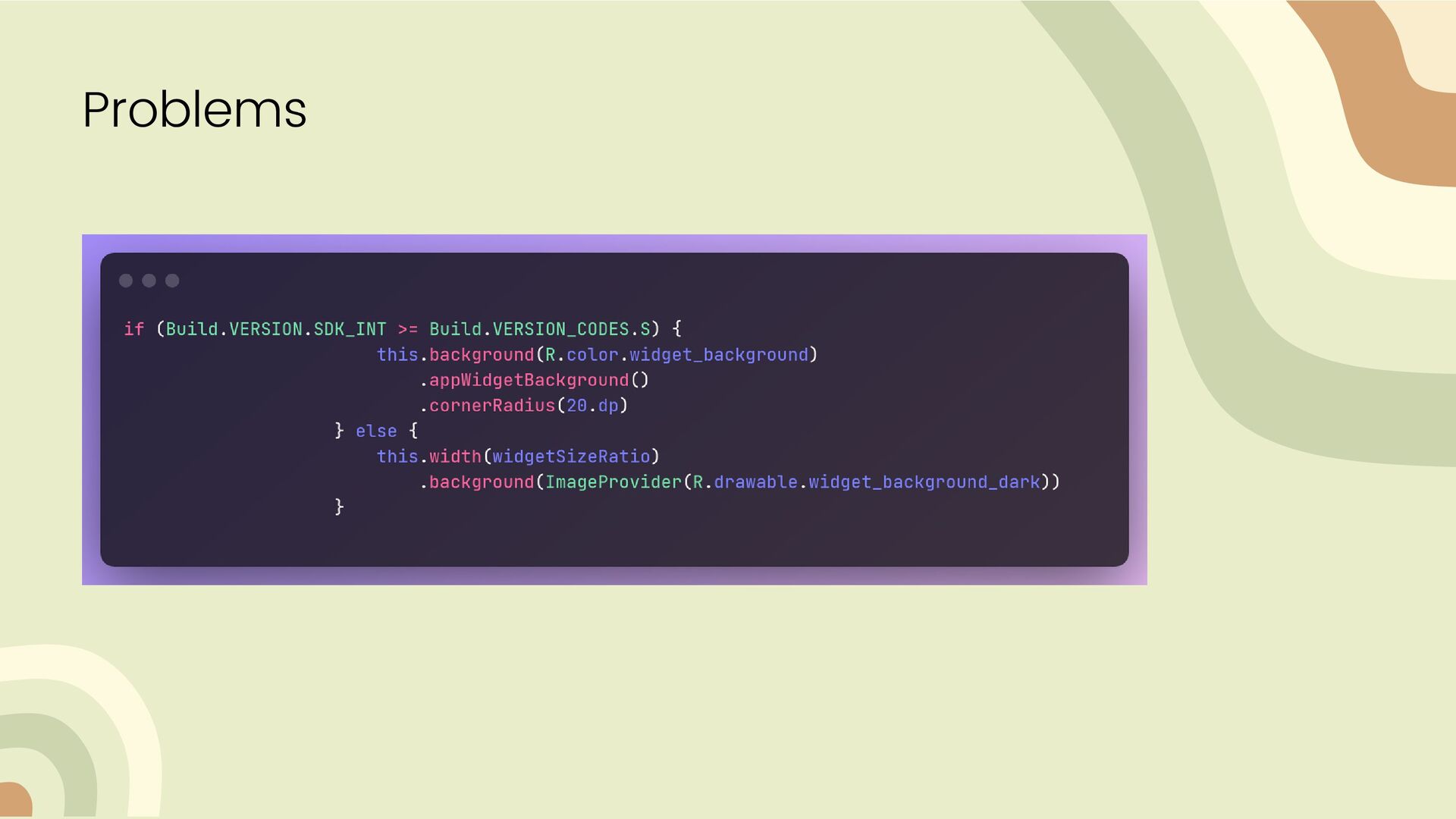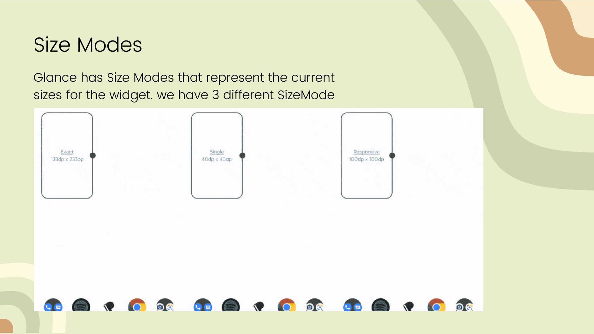 and testing is a pain in the ass No Remote Image Loading the minSDK is 21, we are currently only supporting compatibility till SDK v23. widget round corner support for <SDK 23 NO ROUND CORNERS updating the glance widget is possible only with coroutines