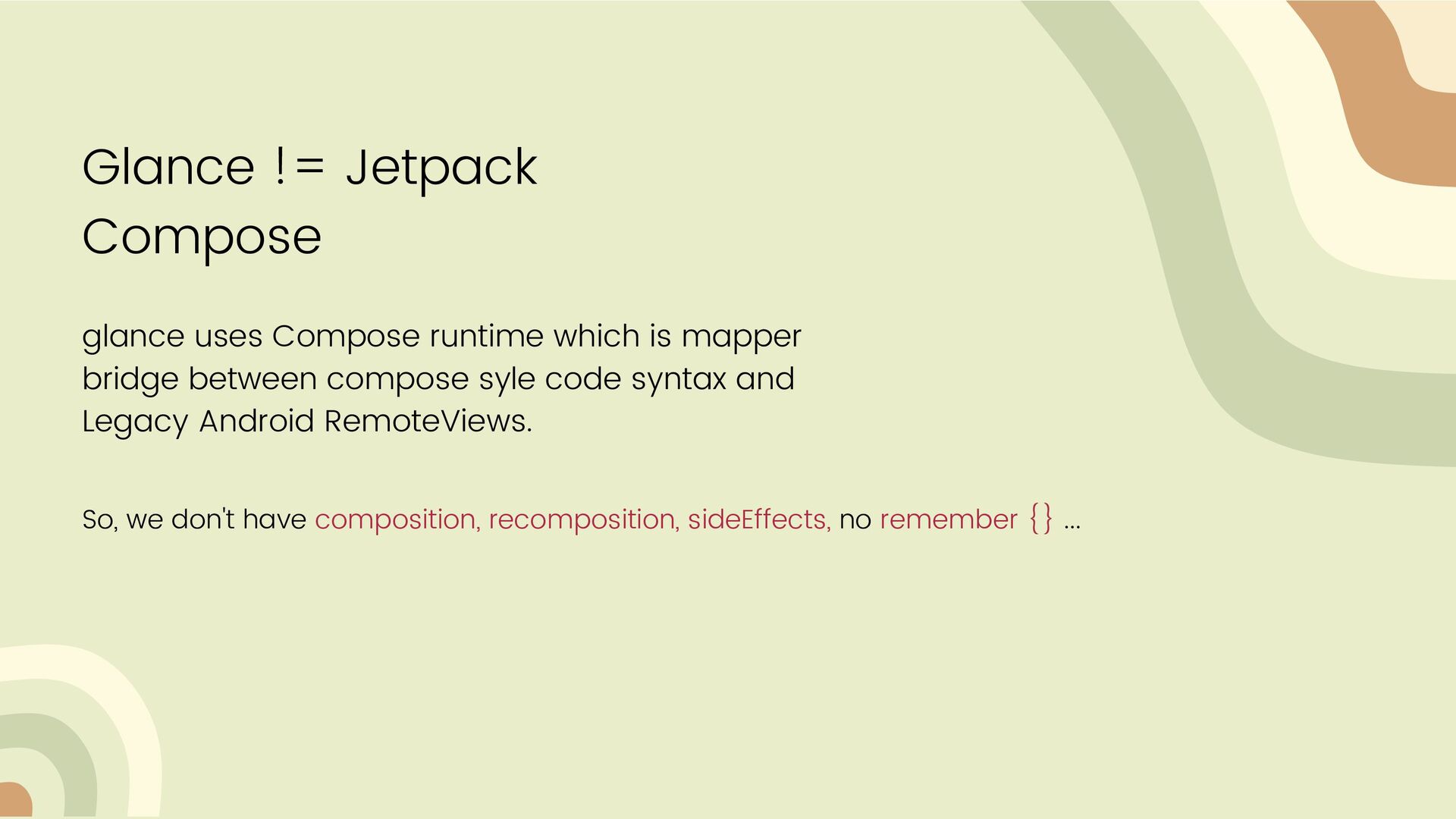 mapper bridge between compose syle code syntax and Legacy Android RemoteViews. So, we don't have composition, recomposition, sideEffects, no remember {} ...