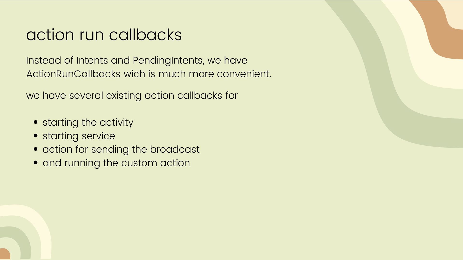 ActionRunCallbacks wich is much more convenient. starting the activity starting service action for sending the broadcast and running the custom action we have several existing action callbacks for