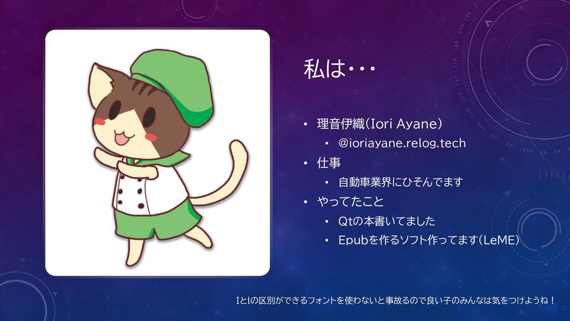 • やってたこと • Qtの本書いてました • Epubを作るソフト作ってます(LeME) Iとlの区別ができるフォントを使わないと事故るので良い子のみんなは気をつけようね!