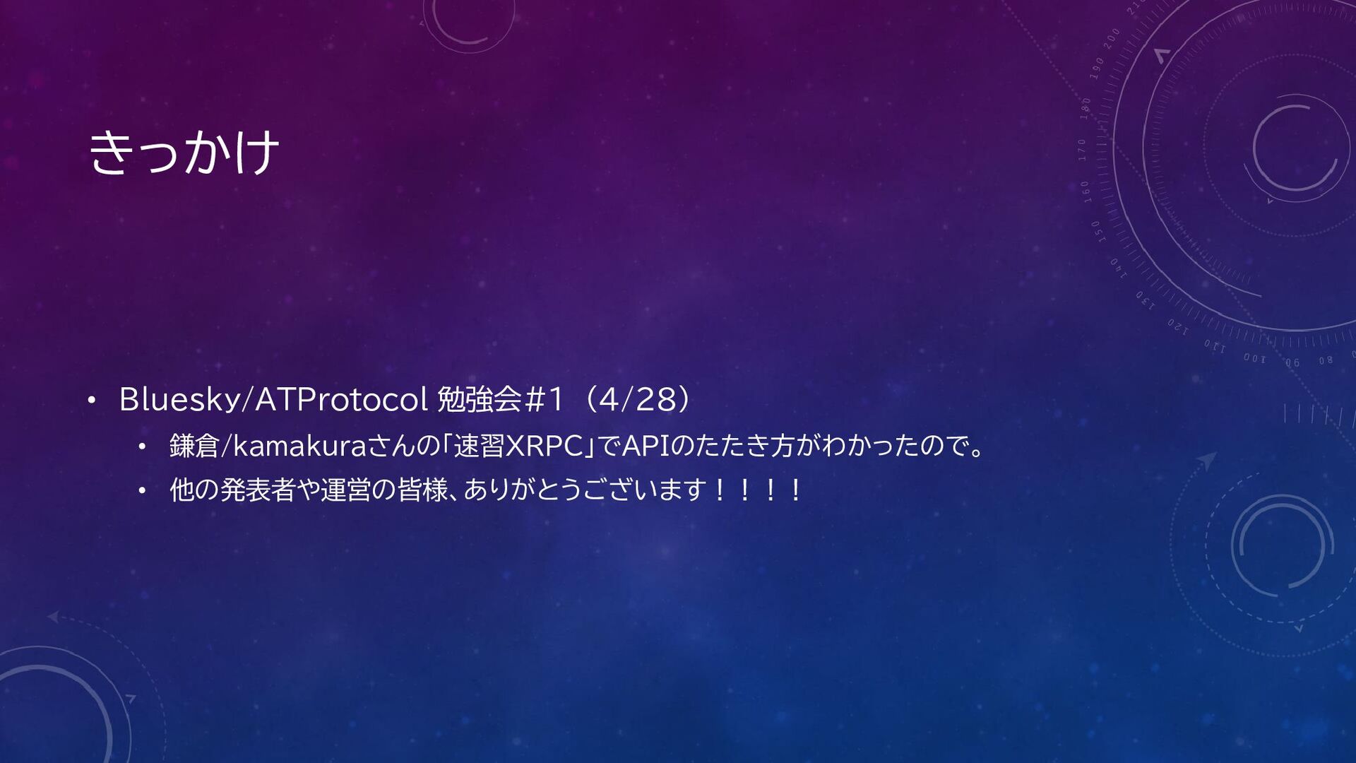 きっかけ • Bluesky/ATProtocol 勉強会#1 (4/28) • 鎌倉/kamakuraさんの「速習XRPC」でAPIのたたき方がわかったので。 • 他の発表者や運営の皆様、ありがとうございます!!!!