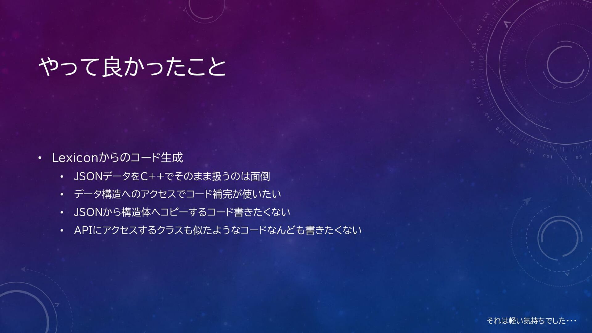 やって良かったこと • Lexiconからのコード生成 • JSONデータをC++でそのまま扱うのは面倒 • データ構造へのアクセスでコード補完が使いたい • JSONから構造体へコピーするコード書きたくない •