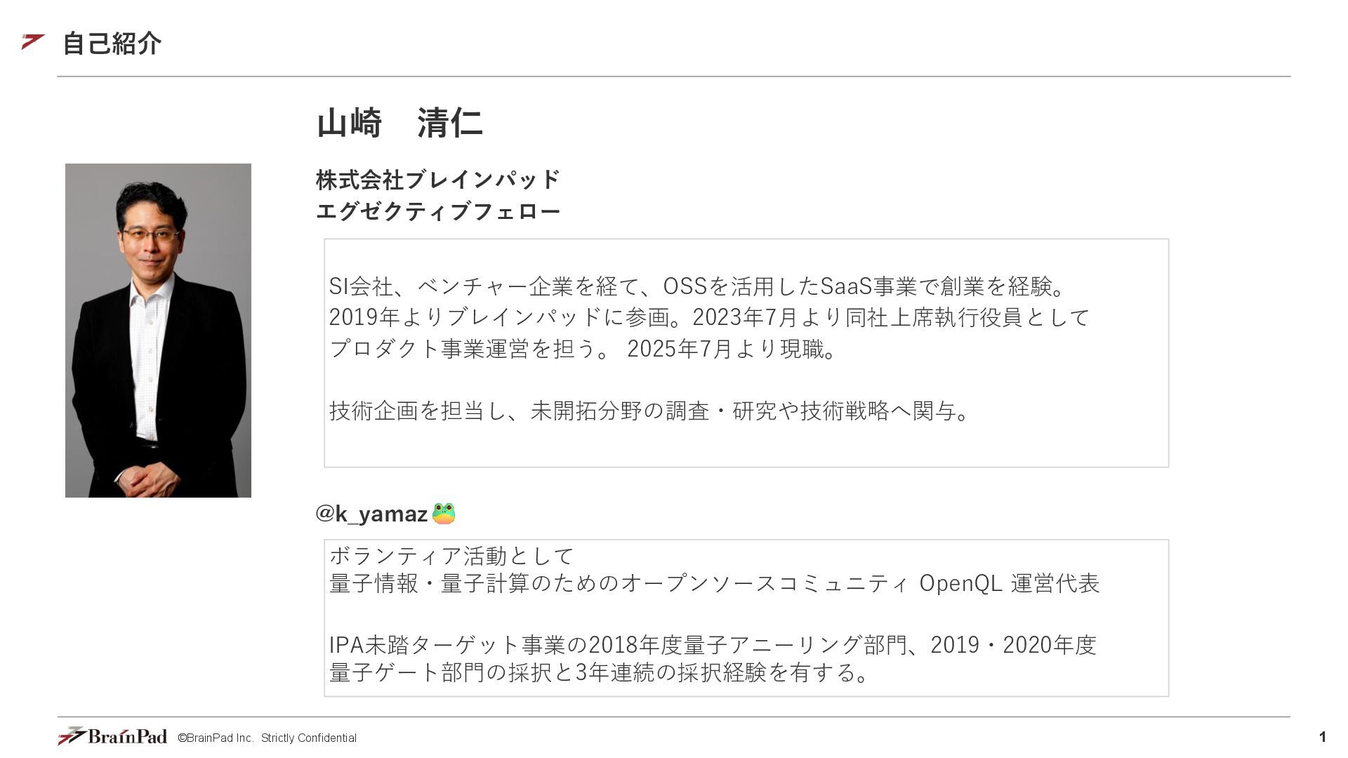 1. 1 ©BrainPad Inc. Strictly Confidential 自己紹介 株式会社ブレインパッド エグゼクティブフェロー 山崎 清仁